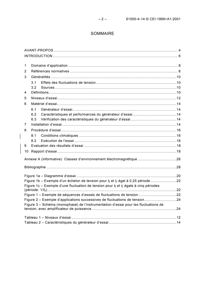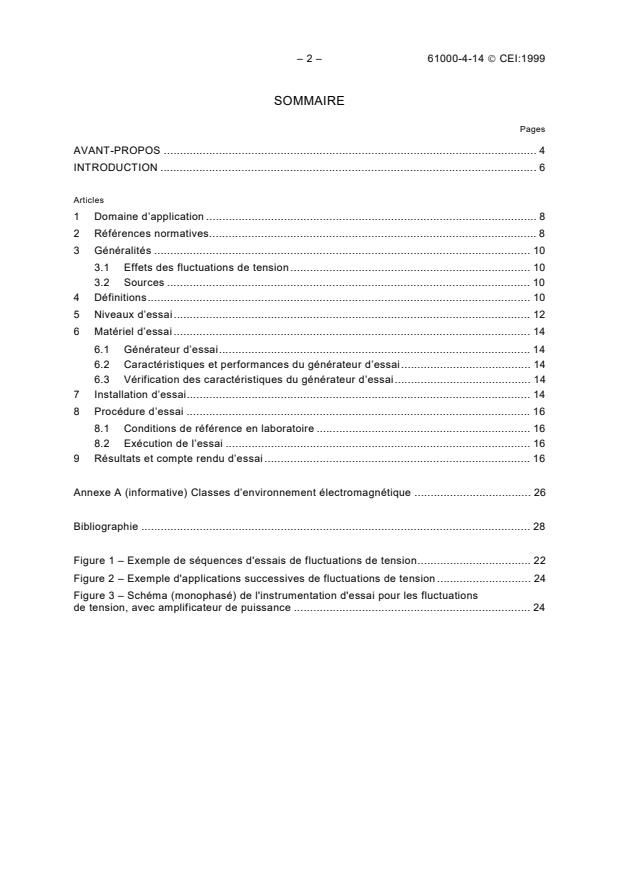 S'applique aux équipements électriques et/ou électroniques absorbant un courant nominal inférieur ou égal à 16 A par phase. A pour but d'établir une référence permettant d'évaluer l'immunité des équipements électriques et/ou électroniques soumis à des fluctuations de tension positive et négative de faible amplitude. Seuls les phénomènes conduits sont pris en compte, notamment les essais d'immunité concernant les équipements raccordés à des réseaux d'alimentation publics ou industriels. Cette norme a le statut de publication fondamentale en CEM.