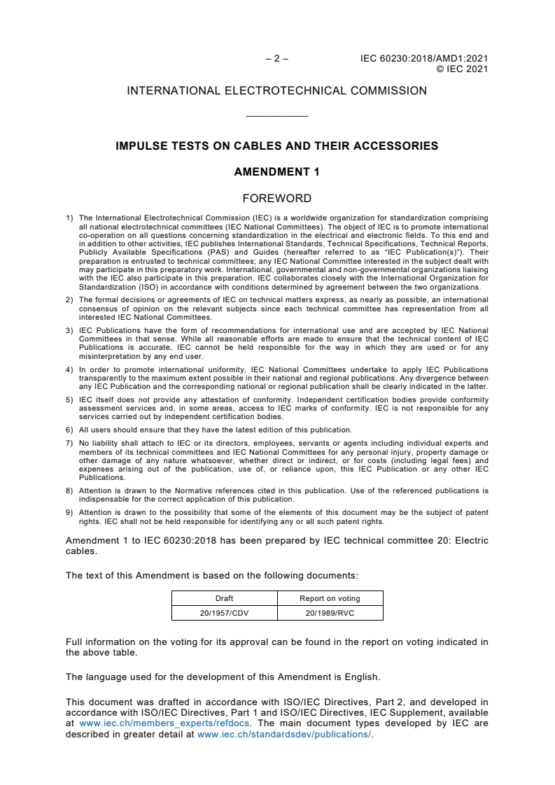 IEC 60230:2018/AMD1:2021 is a standard published by the International Electrotechnical Commission (IEC). Its full title is "Amendment 1 - Impulse tests on cables and their accessories". This standard covers: Amendment 1 - Impulse tests on cables and their accessories