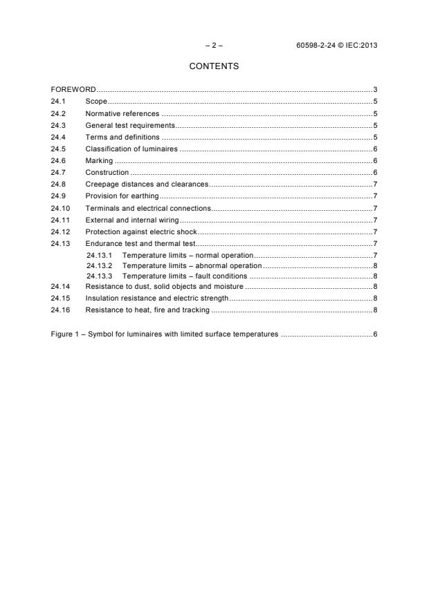 IEC 60598-2-24:2013 is a standard published by the International Electrotechnical Commission (IEC). Its full title is "Luminaires - Part 2-24: Particular requirements - Luminaires with limited surface temperatures". This standard covers: IEC 60598-2-24:2013 series specifies requirements for luminaires intended for use where the necessity of limited temperature on the outer surface exists, due to the risk of thermal effects, combustion or degradation of materials but where the risk of explosion in the atmosphere does not exist. The luminaires are for use with electric light sources on supply voltages not exceeding 1 000 V. This standard specifically excludes requirements for luminaires for use in explosive gas atmospheres and explosive dust atmospheres. This second edition cancels and replaces the first edition published in 1997. It constitutes a technical revision. This edition includes the following significant technical changes with respect to the previous edition: a) change of required degree of protection from IP6X to IP4X to harmonize with the international wiring rules; b) temperature limits introduced for glass surface of any light source exposed to risk of dust. This publication is to be read in conjunction with IEC 60598-1:2008.