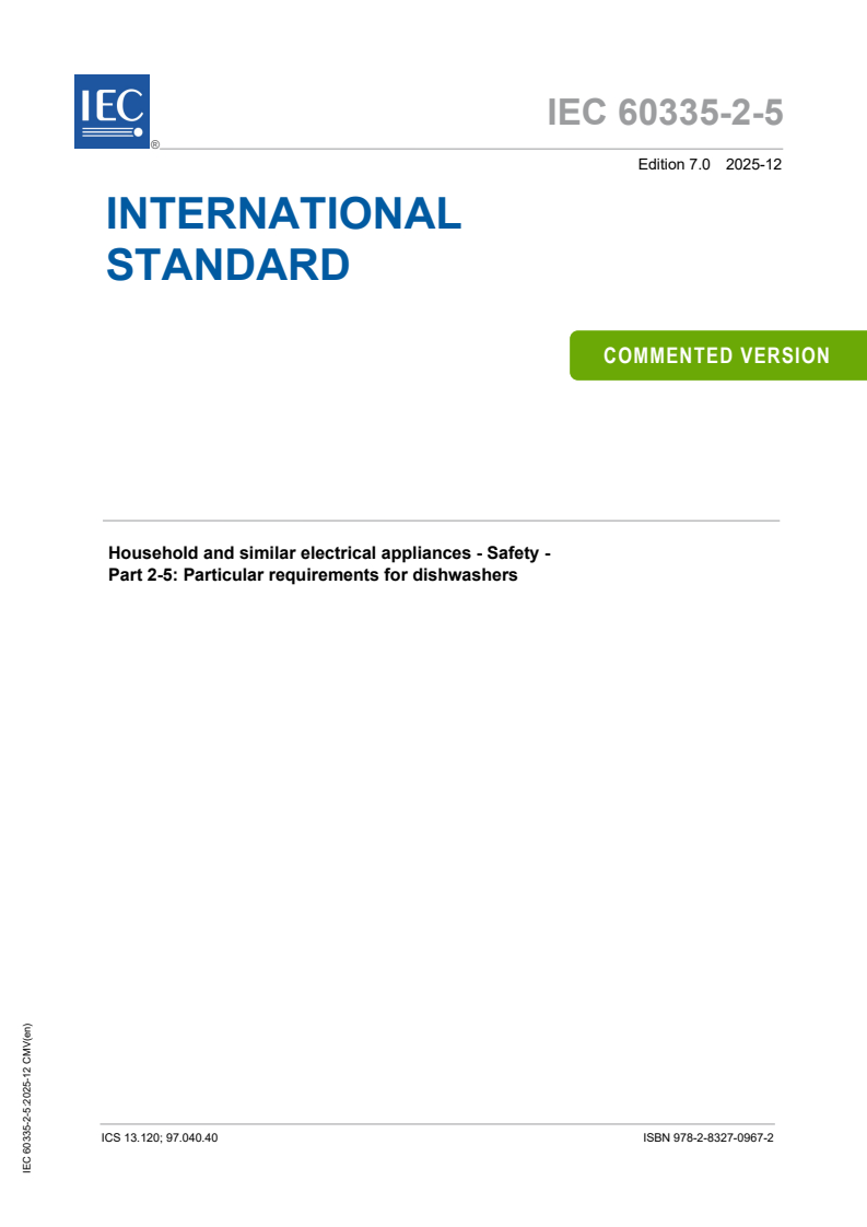REDLINE IEC 60335-2-5:2025 CMV - Household and similar electrical appliances - Safety - Part 2-5: Particular requirements for dishwashers Released:12/18/2025 Isbn:9782832709672
