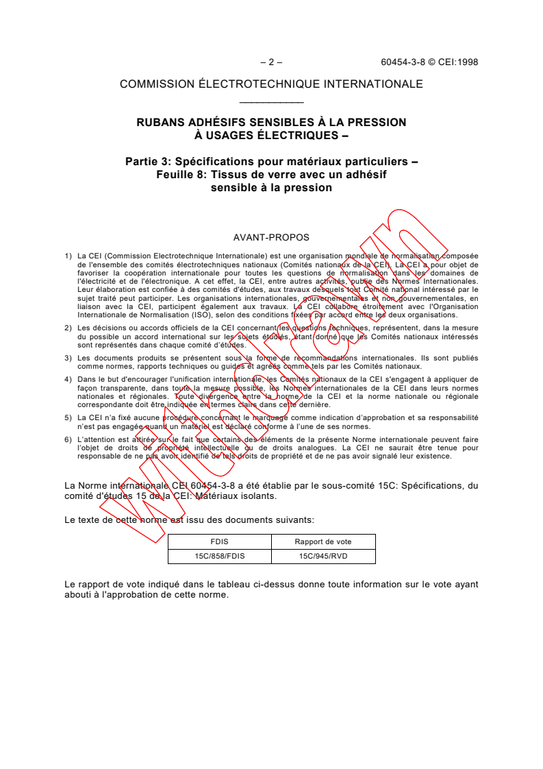 IEC 60454-3-8:1998 is an international standard published by the International Electrotechnical Commission (IEC) that specifies requirements for pressure-sensitive adhesive tapes made from glass fabric for electrical applications. This standard is part of the IEC 60454 series, which addresses pressure-sensitive adhesive tapes designed specifically for electrical purposes. The document focuses on three distinct types of glass fabric tapes, each characterized by a different thermal durability index and adhesive type: