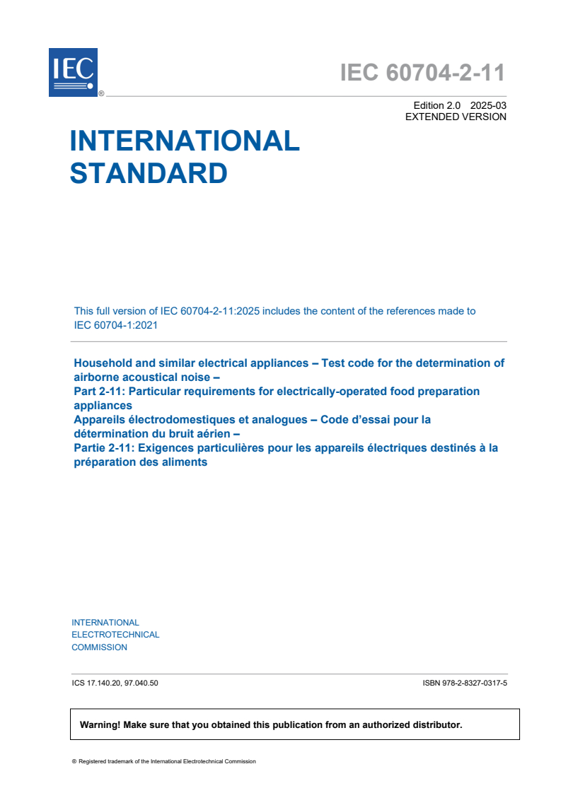 IEC 60704-2-11:2025 EXV - Household and similar electrical appliances - Test code for the determination of airborne acoustical noise - Part 2-11: Particular requirements for electrically-operated food preparation appliances Released:17. 03. 2025 Isbn:9782832703175