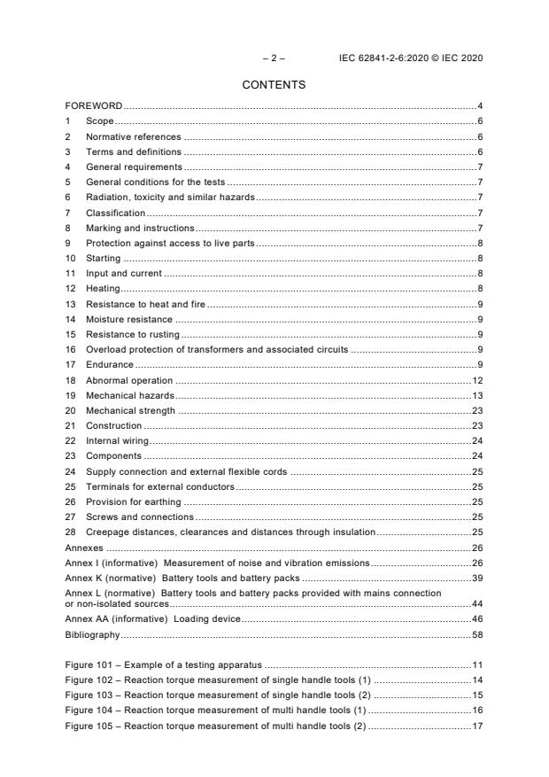 IEC 62841-2-6:2020 Tools covered by this document include percussion hammers and rotary hammers, including rotary hammers with the capability to rotate only with the percussion system disengaged (drill only mode). The rated voltage is not more than 250 V for single-phase a.c. or d.c. tools, and 480 V for three-phase a.c. tools. This document does not apply to drills and impact drills. This document does not apply to tools that are designed exclusively for driving fasteners, such as palm nailers. The content of the corrigendum 1 (2024-10) has been included in this copy.
