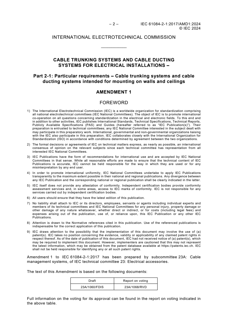 IEC 61084-2-1:2017/AMD1:2024 - Amendment 1 - Cable trunking systems and cable ducting systems for electrical installations - Part 2-1: Particular requirements - Cable trunking systems and cable ducting systems intended for mounting on walls and ceilings Released:3/7/2024 Isbn:9782832282595