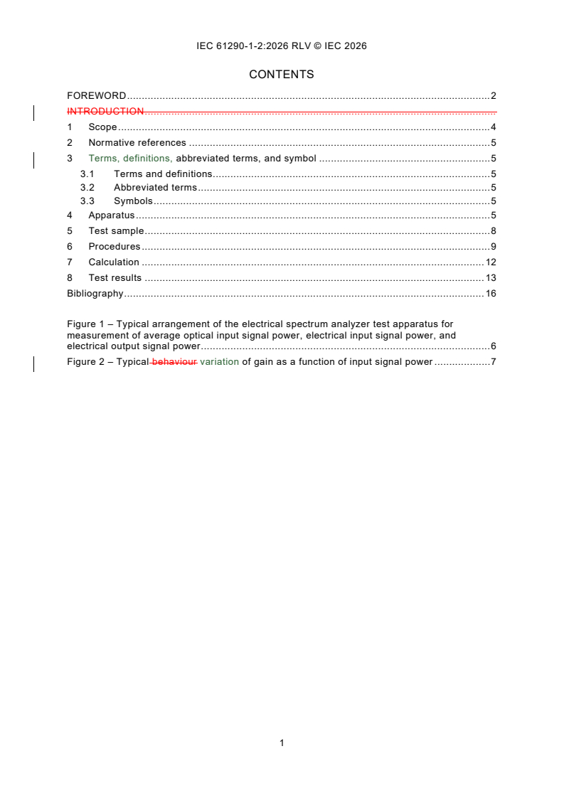IEC 61290-1-2:2026 is a standard published by the International Electrotechnical Commission (IEC). Its full title is "Optical amplifiers - Test methods - Part 1-2: Power and gain parameters - Electrical spectrum analyzer method". This standard covers: IEC 61290-1-2:2026 applies to all commercially available optical amplifiers (OAs) and optically amplified sub-systems. It applies to OAs using optically pumped fibres (OFAs based on either rare-earth doped fibres or on the Raman effect), semiconductors (SOAs), and planar optical waveguides (POWAs). This document does not apply to polarization-maintaining optical amplifiers. This document defines uniform requirements for accurate and reliable measurements, by means of the electrical spectrum analyzer test method, of the following OA parameters, as defined in IEC 61291-1, Clause 3: a) nominal output signal power; b) gain; c) reverse gain; d) maximum gain; e) polarization-dependent gain. In addition, this test method provides a means for measuring the following parameters: - maximum gain wavelength; - gain wavelength band. This document specifically covers single-channel amplifiers. For multichannel amplifiers, the IEC 61290-10 series applies. NOTE 1 The applicability of the test methods described in this document to distributed Raman amplifiers is for further study. NOTE 2 A test method for polarization-maintaining optical amplifiers is for further study. This third edition cancels and replaces the second edition published in 2005. This edition constitutes a technical revision. This edition includes the following significant technical changes with respect to the previous edition: a) addition of information on the applicability of this document to the scope; b) harmonization of the scope with the IEC 61290-1 series; c) addition of safety recommendations to Clause 4 and Clause 5; d) correction of an error in Clause 7, item e); e) replacement of the term "wavelength measurement accuracy" with "wavelength accuracy".