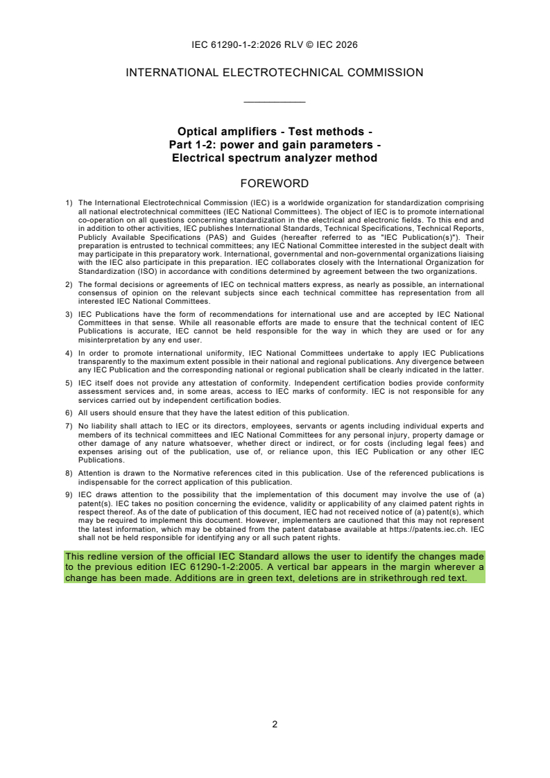 IEC 61290-1-2:2026 applies to all commercially available optical amplifiers (OAs) and optically amplified sub-systems. It applies to OAs using optically pumped fibres (OFAs based on either rare-earth doped fibres or on the Raman effect), semiconductors (SOAs), and planar optical waveguides (POWAs). This document does not apply to polarization-maintaining optical amplifiers. This document defines uniform requirements for accurate and reliable measurements, by means of the electrical spectrum analyzer test method, of the following OA parameters, as defined in IEC 61291-1, Clause 3: a) nominal output signal power; b) gain; c) reverse gain; d) maximum gain; e) polarization-dependent gain. In addition, this test method provides a means for measuring the following parameters: - maximum gain wavelength; - gain wavelength band. This document specifically covers single-channel amplifiers. For multichannel amplifiers, the IEC 61290-10 series applies. NOTE 1 The applicability of the test methods described in this document to distributed Raman amplifiers is for further study. NOTE 2 A test method for polarization-maintaining optical amplifiers is for further study. This third edition cancels and replaces the second edition published in 2005. This edition constitutes a technical revision. This edition includes the following significant technical changes with respect to the previous edition: a) addition of information on the applicability of this document to the scope; b) harmonization of the scope with the IEC 61290-1 series; c) addition of safety recommendations to Clause 4 and Clause 5; d) correction of an error in Clause 7, item e); e) replacement of the term "wavelength measurement accuracy" with "wavelength accuracy".