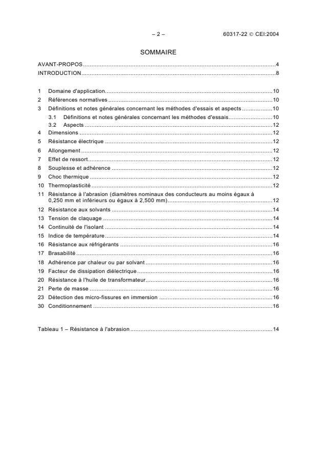 IEC 60317-22:2004 is a standard published by the International Electrotechnical Commission (IEC). Its full title is "Specifications for particular types of winding wires - Part 22: Polyester or polyesterimide enamelled round copper wire overcoated with polyamide, class 180". This standard covers: Specifies the requirements of enamelled round copper winding wire of class 180 with a dual coating. The underlying coating is based on polyester or polyesterimide resin, which may be modified providing it retains the chemical identity of the original resin and meets all specified wire requirements. The superimposed coating is based on polyamide resin. Class 180 is a thermal class that requires a minimum temperature index of 180 and a heat shock temperature of at least 200°C. The temperature in degrees Celsius corresponding to the temperature index is not necessarily that at which it is recommended that the wire be operated and this will depend on many factors, including the type of equipment involved. The range of nominal conductor diameters covered by this standard is as follows: - grade 1: 0,050 mm up to and including 3,150 mm; - grade 2: 0,050 mm up to and including 5,000 mm; - grade 3: 0,250 mm up to and including 1,600 mm. The nominal conductor diameters are specified in Clause 4 of IEC 60317-0-1. The main changes with respect to the previous edition are listed below: - new requirements for appearance, Subclause 3.2, added; - breakdown voltage values, former Table 3, replaced with a reference to IEC 60317-0-1; - new pin hole test, Clause 23, added.