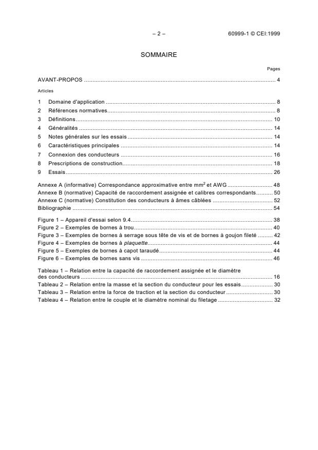 IEC 60999-1:1999 S'applique aux organes de serrage à vis et sans vis pour dispositifs de connexion, soit en tant que parties séparées, soit en tant que parties intégrantes du matériel pour la connexion de conducteurs électriques en cuivre (conformes à la CEI 60228), rigides (massifs ou câblés) et souples, ayant une section de 0,5 mm2 jusqu'à et y compris 35 mm2 et de tailles équivalentes AWG avec une tension assignée ne dépassant pas 1 000 V en courant alternatif, de fréquence jusqu'à et y compris 1 000 Hz, et 1 500 V en courant continu.