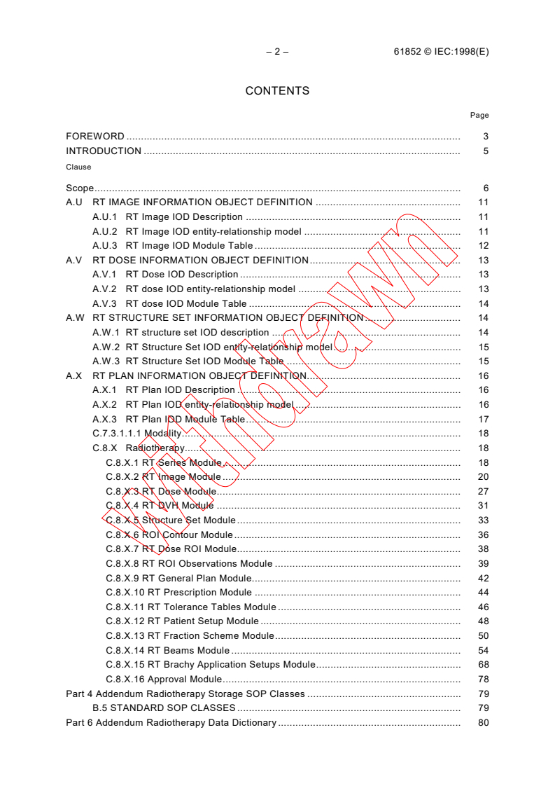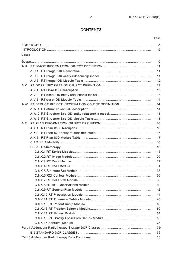 IEC TR 61852:1998 is a technical report published by the International Electrotechnical Commission (IEC). Its full title is "Medical electrical equipment - Digital imaging and communications in medicine (DICOM) - Radiotherapy objects". This standard covers: This report is supplement 11 to the DICOM standard. It defines a number of information objects applicable to the domain of radiation oncology. The intent of these objects is to support the transfer of radiotherapy-related data between devices found within and outside a radiotherapy department.