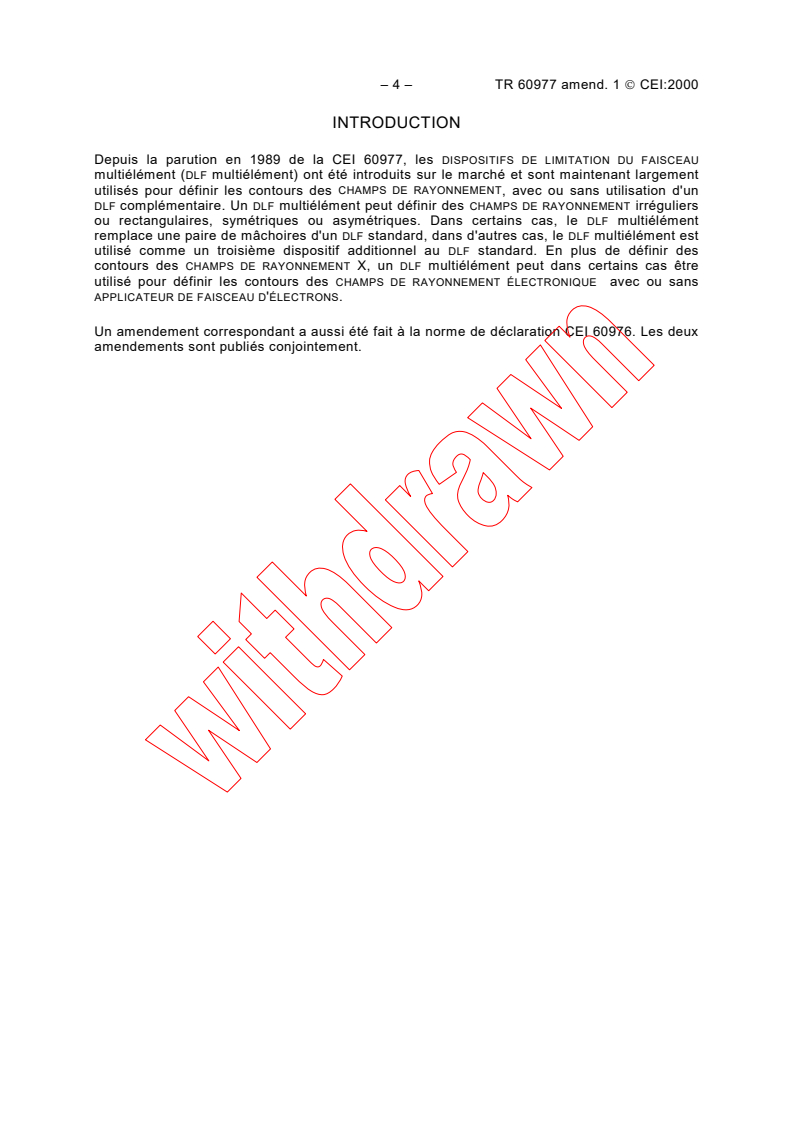 IEC TR 60977:1989/AMD1:2000 is a technical report published by the International Electrotechnical Commission (IEC). Its full title is "Amendment 1 - Medical electrical equipment - Medical electron accelerators in the range 1 MeV to 50 MeV - Guidelines for functional performance characteristics". This standard covers: Includes multi-element beam limiting devices (multielement BLDs) which are widely used for determining the shape of the radiation field.