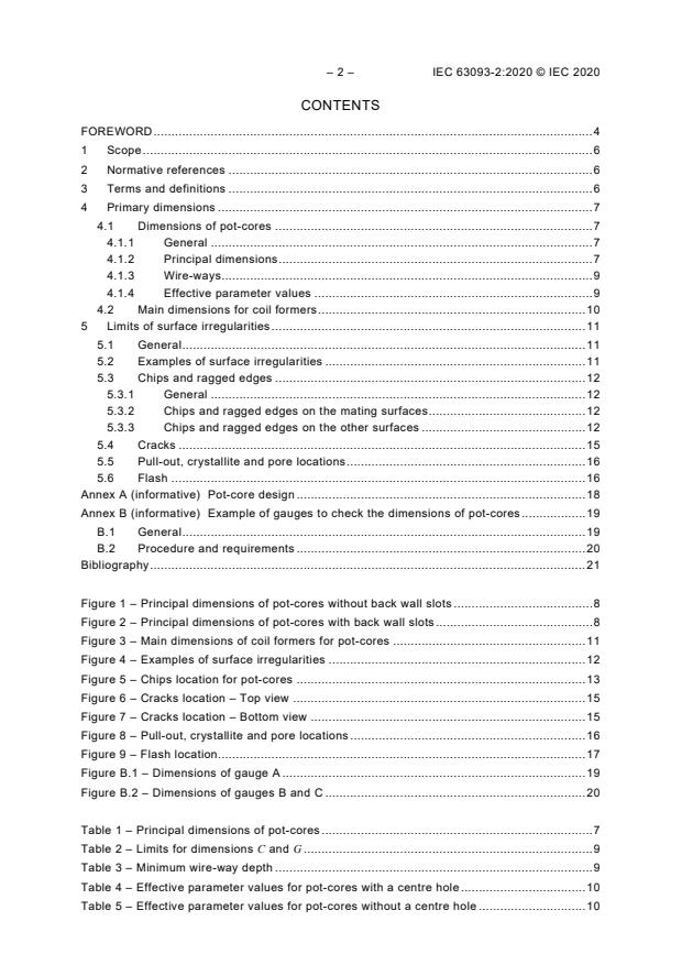 IEC 63093-2:2020 specifies the dimensions that are of importance for mechanical interchangeability for a preferred range of pot-cores made of ferrite, and the dimensional limits for coil formers to be used with them, as well as the effective parameter values to be used in calculations involving them. It also gives guidelines on the allowable limits of surface irregularities applicable to pot-cores in accordance with the relevant generic specification. The selection of core sizes and shapes for this document is based on the philosophy of including those sizes which are industrial standards, either by inclusion in a national standard, or by broad-based use in industry. See IEC 62317-1 for more detail concerning the philosophy of selecting core sizes to be included. The general considerations upon which the design of this range of cores is based are given in Annex A. This first edition cancels and replaces the first edition of IEC 62317-2 published in 2010. This edition constitutes a technical revision. This edition includes the following significant technical changes with respect to the previous edition of IEC 62317-2: a) addition of the limits of surface irregularities; b) Table 4 and Table 5 are updated in accordance with IEC 60205:2016.