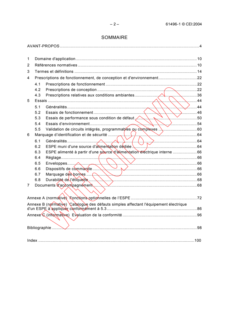 définit les prescriptions générales de conception, de construction et d'essai des équipements de protection électro-sensibles (ESPE) sans contact spécifiquement conçus pour détecter des personnes au sein d'un système relatif à la sécurité. Une attention particulière est portée sur les prescriptions de fonctionnement et de conception assurant que le niveau de sécurité approprié est atteint. Un ESPE peut proposer des fonctions optionnelles, liées à la sécurité: les prescriptions pour celles-ci sont énumérées en Annexe A.