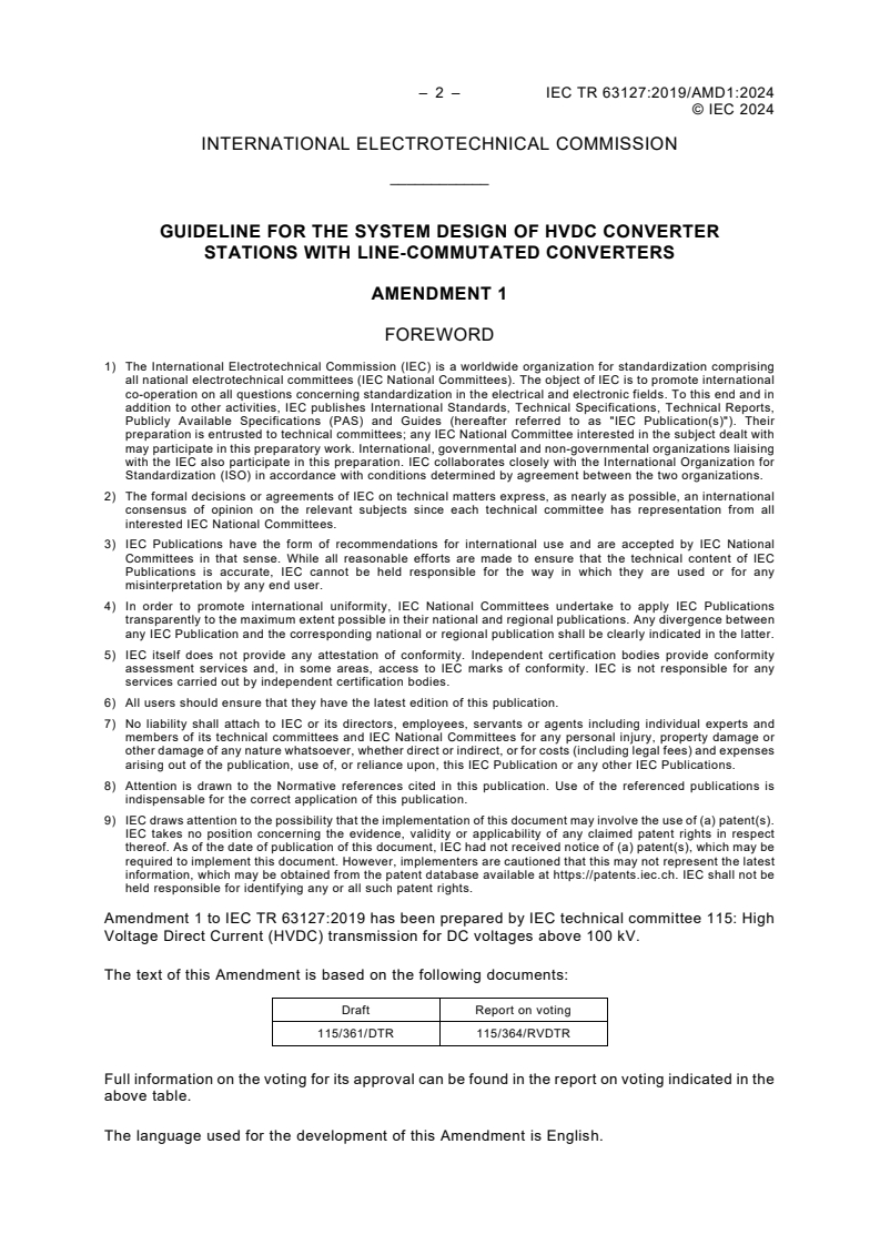 IEC TR 63127:2019/AMD1:2024 is a technical report published by the International Electrotechnical Commission (IEC). Its full title is "Amendment 1 - Guideline for the system design of HVDC converter stations with line-commutated converters". This standard covers: Amendment 1 - Guideline for the system design of HVDC converter stations with line-commutated converters
