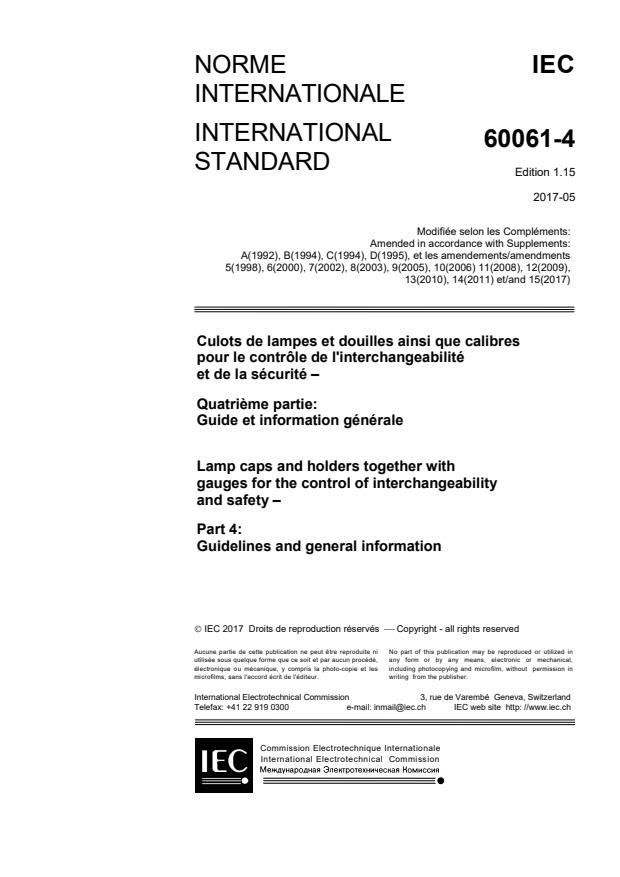 IEC 60061-4:1990/AMD15:2017 is a standard published by the International Electrotechnical Commission (IEC). Its full title is "Amendment 15 - Lamp caps and holders together with gauges for the control of interchangeability and safety - Part 4: Guidelines and general information". This standard covers: Amendment 15 - Lamp caps and holders together with gauges for the control of interchangeability and safety - Part 4: Guidelines and general information