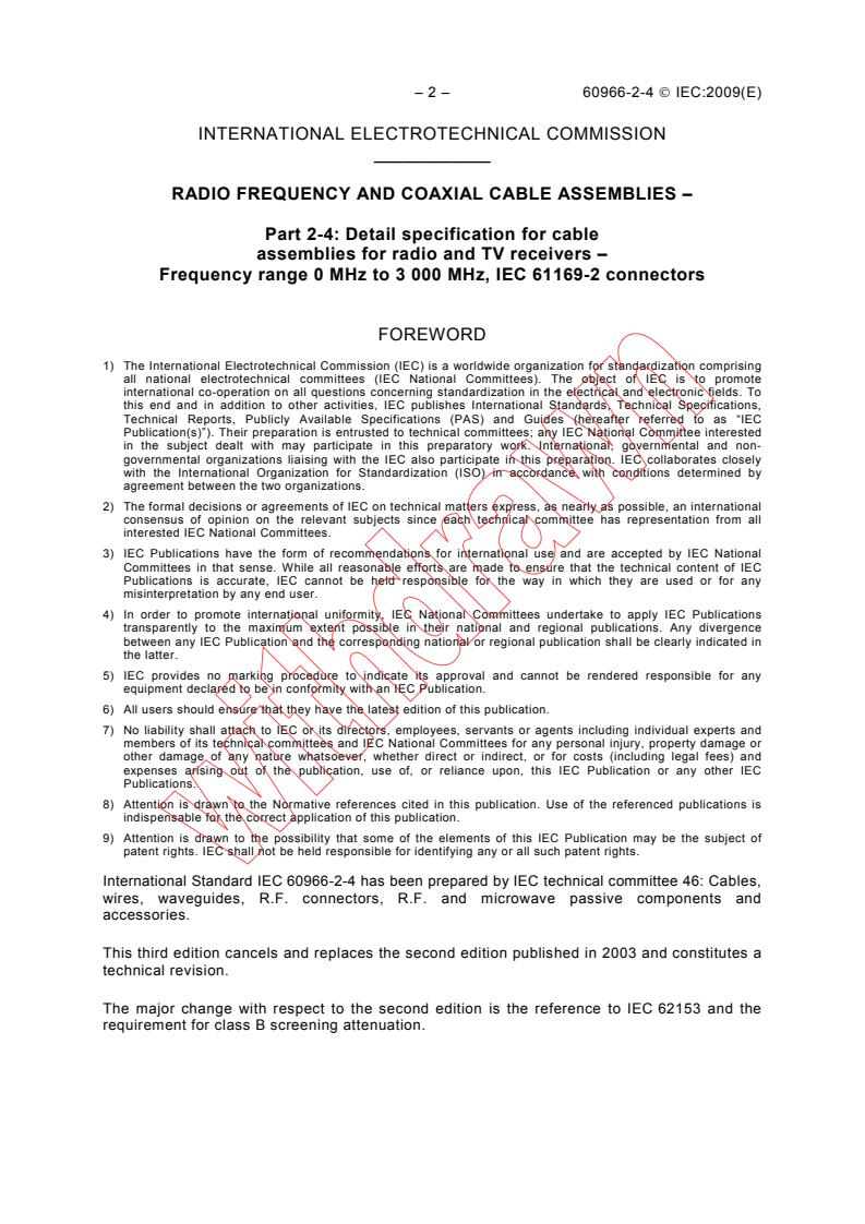 IEC 60966-2-4:2009 - Radio frequency and coaxial cable assemblies - Part 2-4: Detail specification for cable assemblies for radio and TV receivers - Frequency range 0 MHz to 3 000 MHz, IEC 61169-2 connectors Released:1/12/2009