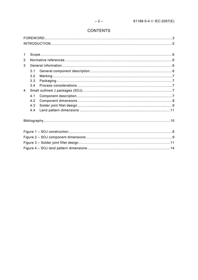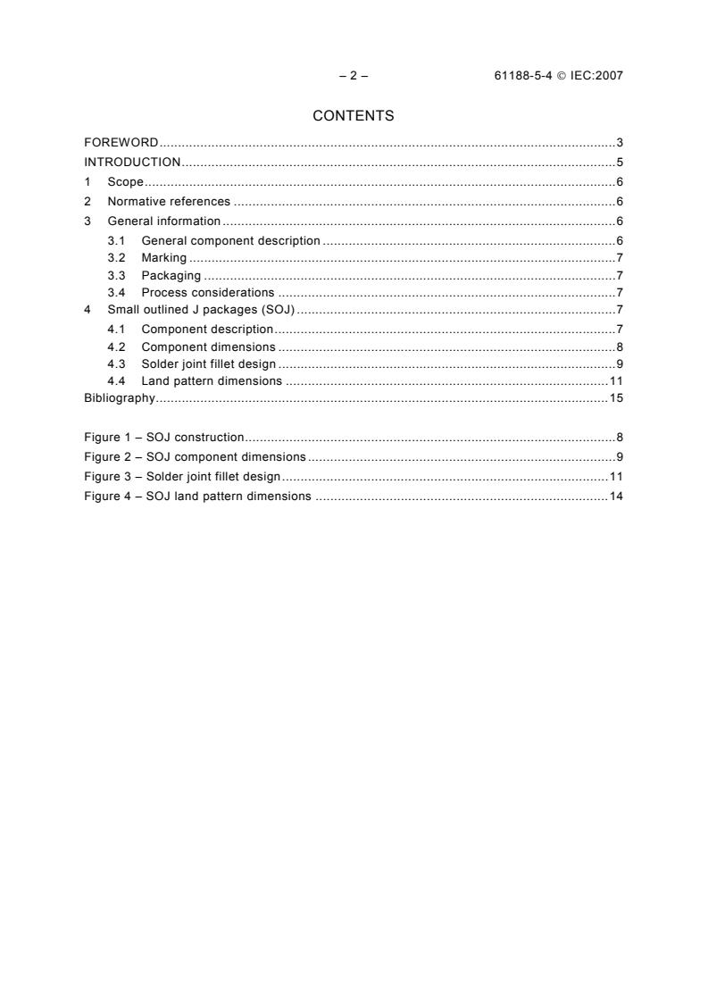 IEC 61188-5-4:2007 provides the component and land pattern dimensions for small outline integrated circuits with "J" leads on two sides (SOJ components) used in the reflow soldering process. Basic construction of the SOJ device is also covered. Clause 4 lists the tolerances and target solder joint dimensions used to arrive at the land pattern dimensions.