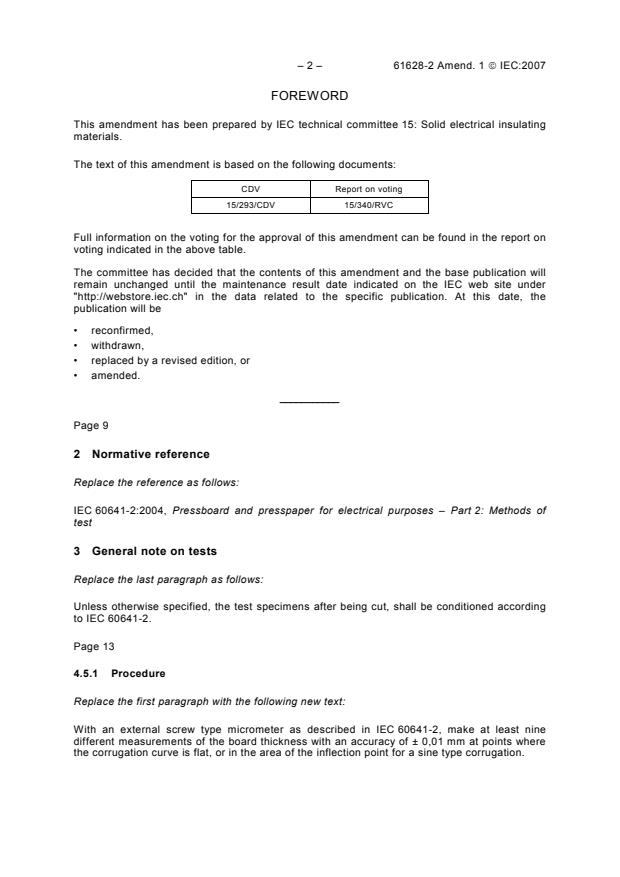 IEC 61628-2:1998/AMD1:2007 is a standard published by the International Electrotechnical Commission (IEC). Its full title is "Amendment 1 - Corrugated pressboard and presspaper for electrical purposes - Part 2: Methods of test". This standard covers: Amendment 1 - Corrugated pressboard and presspaper for electrical purposes - Part 2: Methods of test