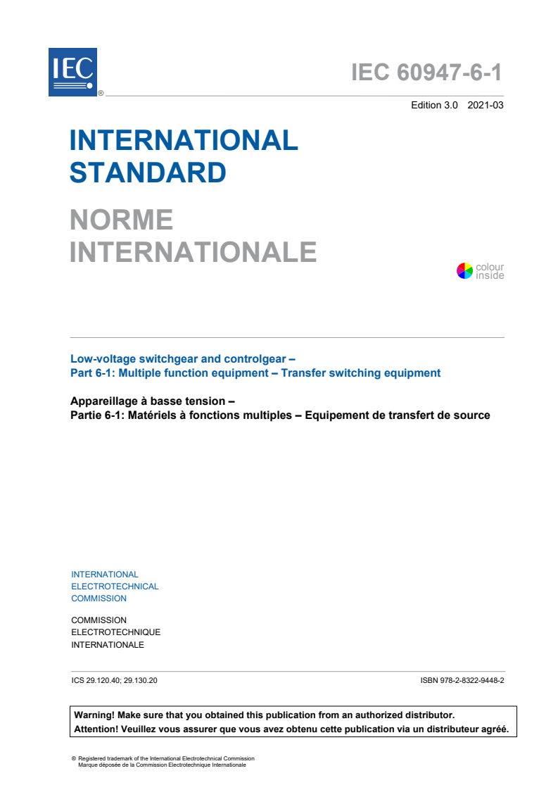 IEC 60947-6-1:2021 applies to transfer switching equipment (TSE), to be used in power systems for ensuring the continuity of the supply and allowing the energy management of the installation, by transferring a load between power supply sources, the rated voltage of which does not exceed 1 000 V AC or 1 500 V DC.
