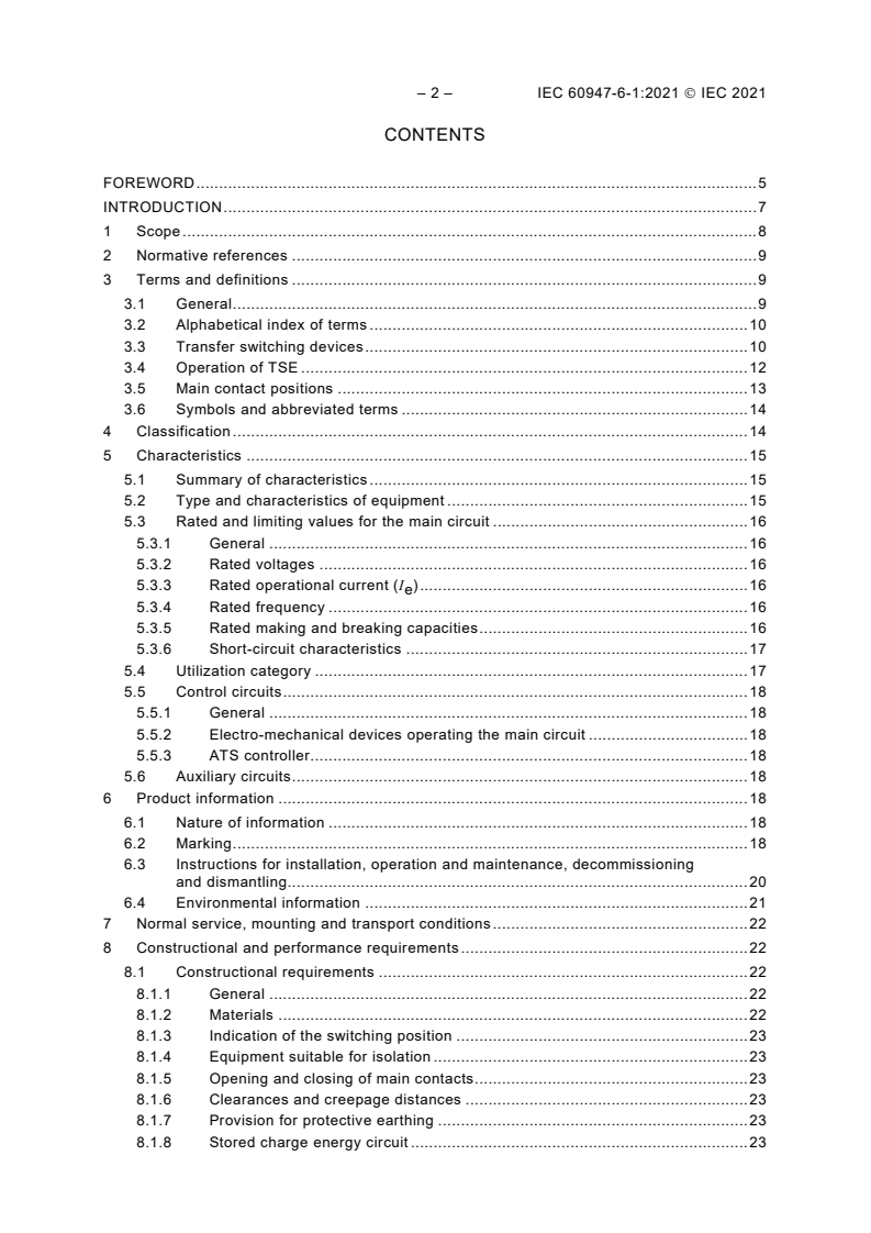 IEC 60947-6-1:2021 applies to transfer switching equipment (TSE), to be used in power systems for ensuring the continuity of the supply and allowing the energy management of the installation, by transferring a load between power supply sources, the rated voltage of which does not exceed 1 000 V AC or 1 500 V DC. This third edition cancels and replaces the second edition published in 2005, and its Amendment 1:2013. This edition constitutes a technical revision. This edition includes the following significant technical changes with respect to the previous edition: – clarification of scope and object; – clarification of terms and definitions; – removal of unnecessary definitions; – modification of characteristics; – modification of utilization categories definitions; – introduction of new markings requirements; – addition of new requirements for clearances and creepage distances; – addition of new requirements and tests for mechanical and electrical interlocks; – clarification of transfer sequences; – modification of requirements for rated short-time withstand currents; – modification of new requirements for electromagnetic compatibility; – clarification of performance requirements for CB type TSE, in alignment with requirements stated in IEC 60947-2; – addition of new test sequence V: Critical load current performance of equipment with DC ratings.