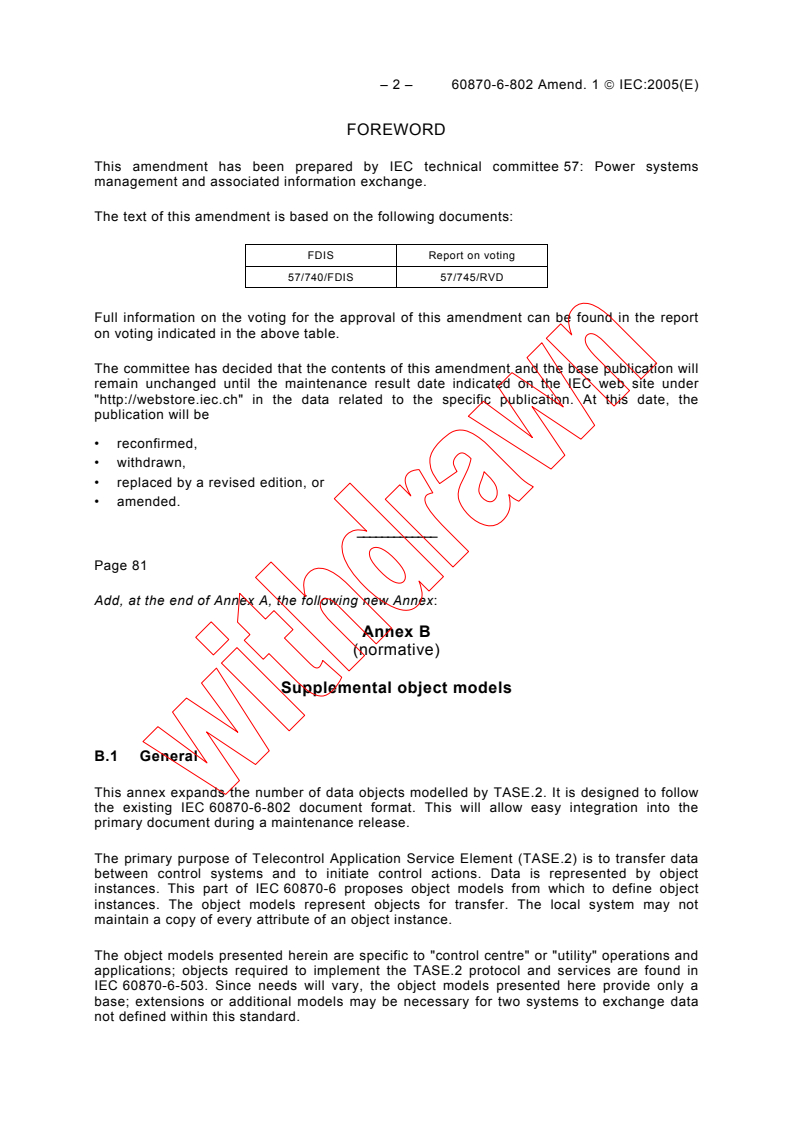 IEC 60870-6-802:2002/AMD1:2005 is Amendment 1 to Part 6-802 of the IEC 60870 series. It supplements the original TASE.2 (Telecontrol Application Service Element) object models used for telecontrol protocols that are compatible with ISO and ITU‑T recommendations. The amendment adds a normative Annex B that expands the set of standardized object models for telecontrol/SCADA data exchange and defines how those objects map to MMS (Manufacturing Message Specification) types and ASN.1 encodings.