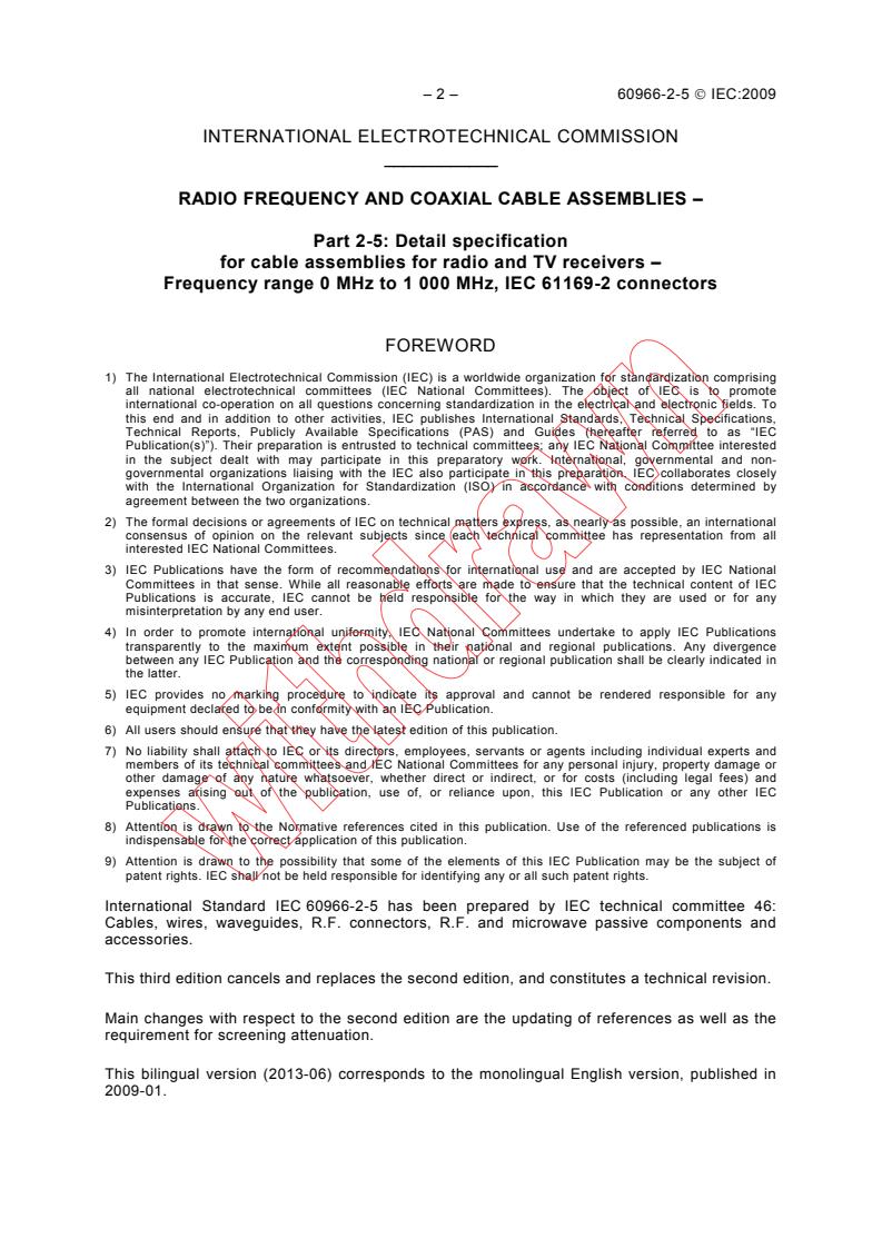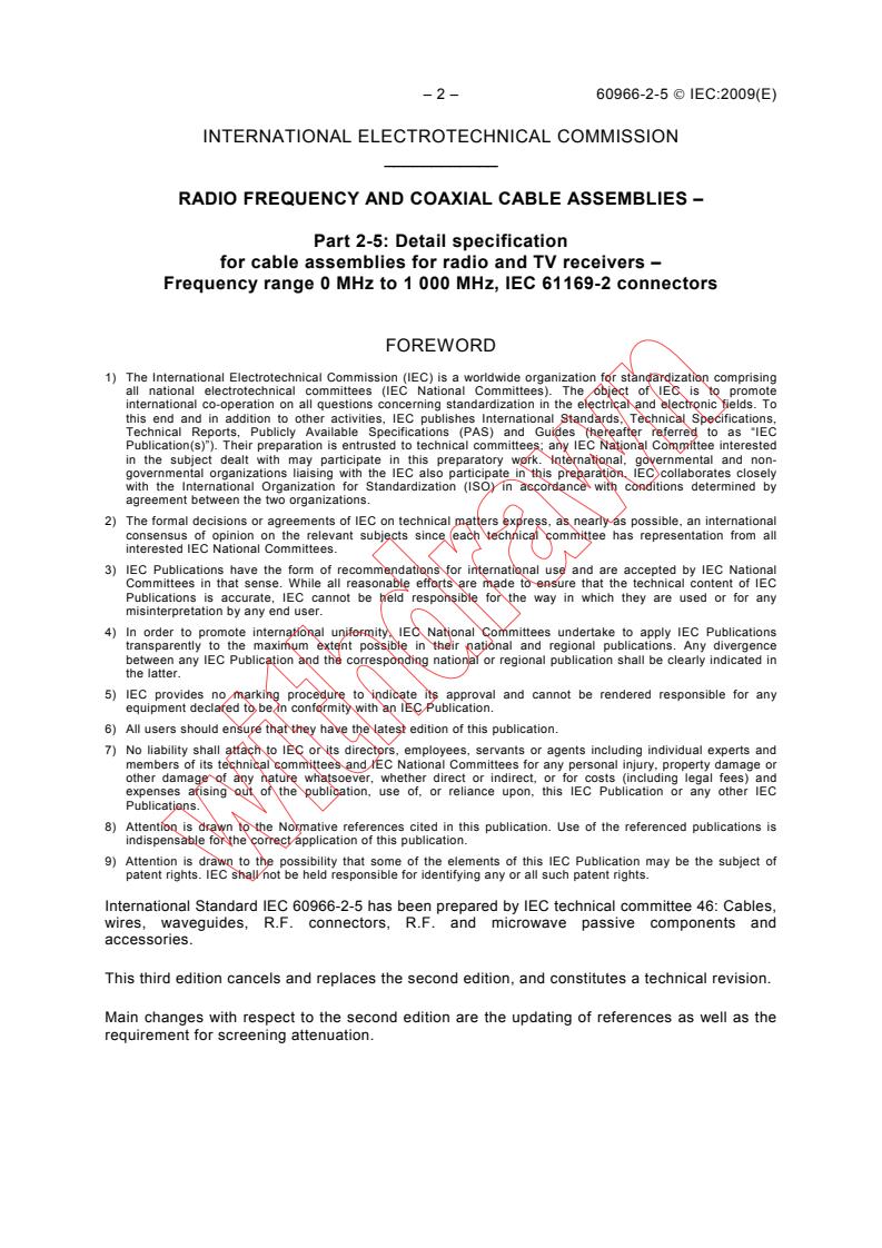 IEC 60966-2-5:2009 is an international standard issued by the International Electrotechnical Commission (IEC) that specifies detailed requirements for radio frequency (RF) and coaxial cable assemblies used in radio and TV receivers. The standard addresses cable assemblies with a frequency range from 0 MHz to 1,000 MHz and applies specifically to flexible coaxial cables described by IEC 60096-2. It focuses on the cable assemblies subfamily 9,52, which incorporate connectors compliant with IEC 61169-2.