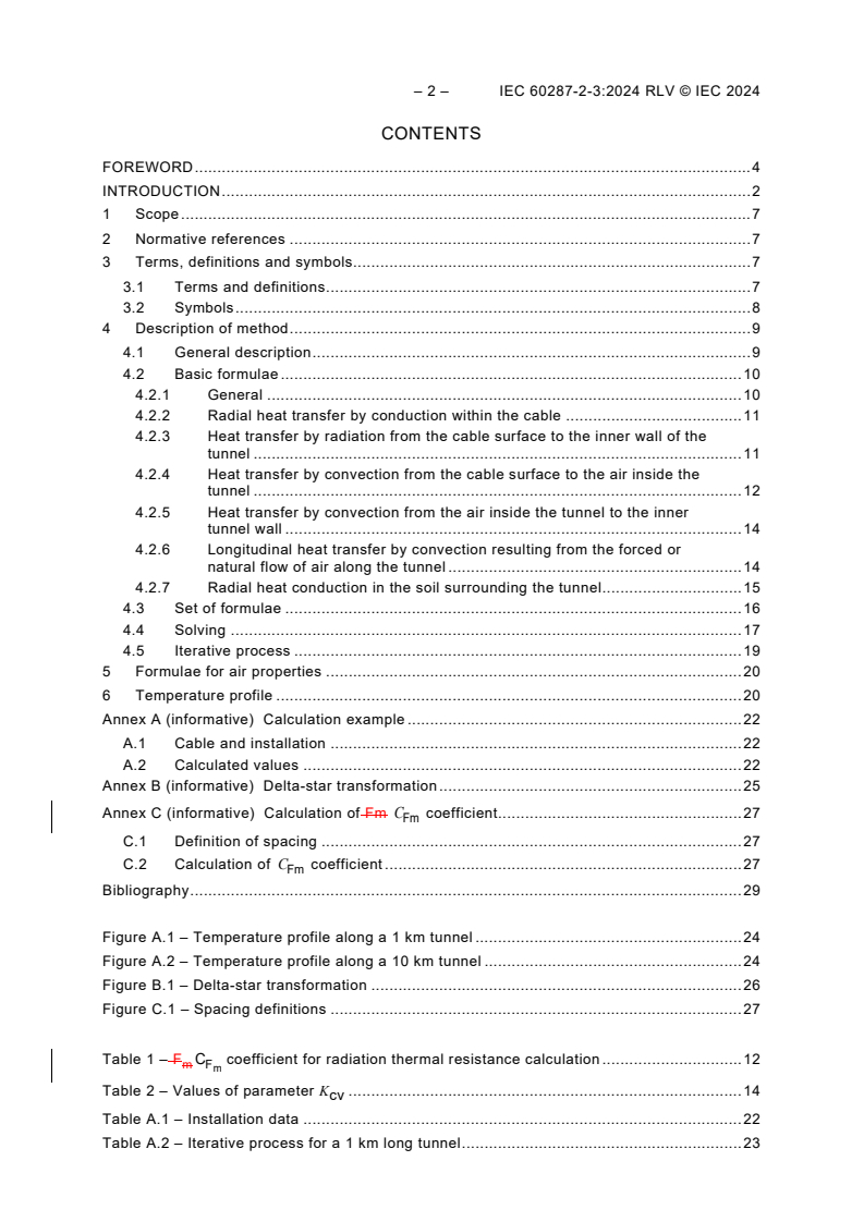 IEC 60287-2-3:2024 describes a method for calculating the continuous current rating factor for cables of all voltages installed in ventilated tunnels. The method is applicable to any type of cable. The method applies to natural as well as forced ventilation. Longitudinal heat transfer within the cables and the surroundings of the tunnel is assumed to be negligible. All cables are assumed to be identical within the tunnel and it is assumed that the tunnel cross-section does not change with distance along the tunnel.