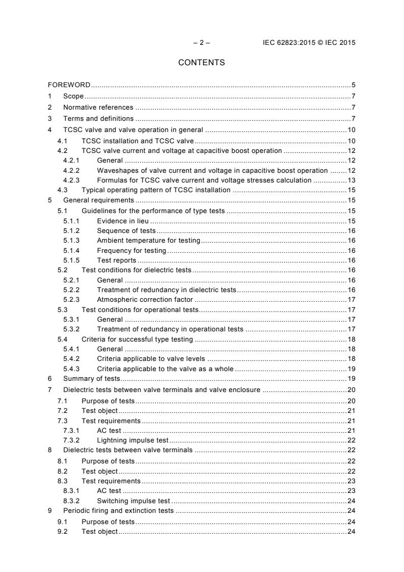 IEC 62823:2015 is a standard published by the International Electrotechnical Commission (IEC). Its full title is "Thyristor valves for thyristor controlled series capacitors (TCSC) - Electrical testing". This standard covers: IEC 62823:2015 defines routine and type tests on thyristor valves used in thyristor controlled series capacitor (TCSC) installations for a.c. power transmission. The tests specified in this standard are based on air insulated valves operating in capacitive boost mode or bypass mode.