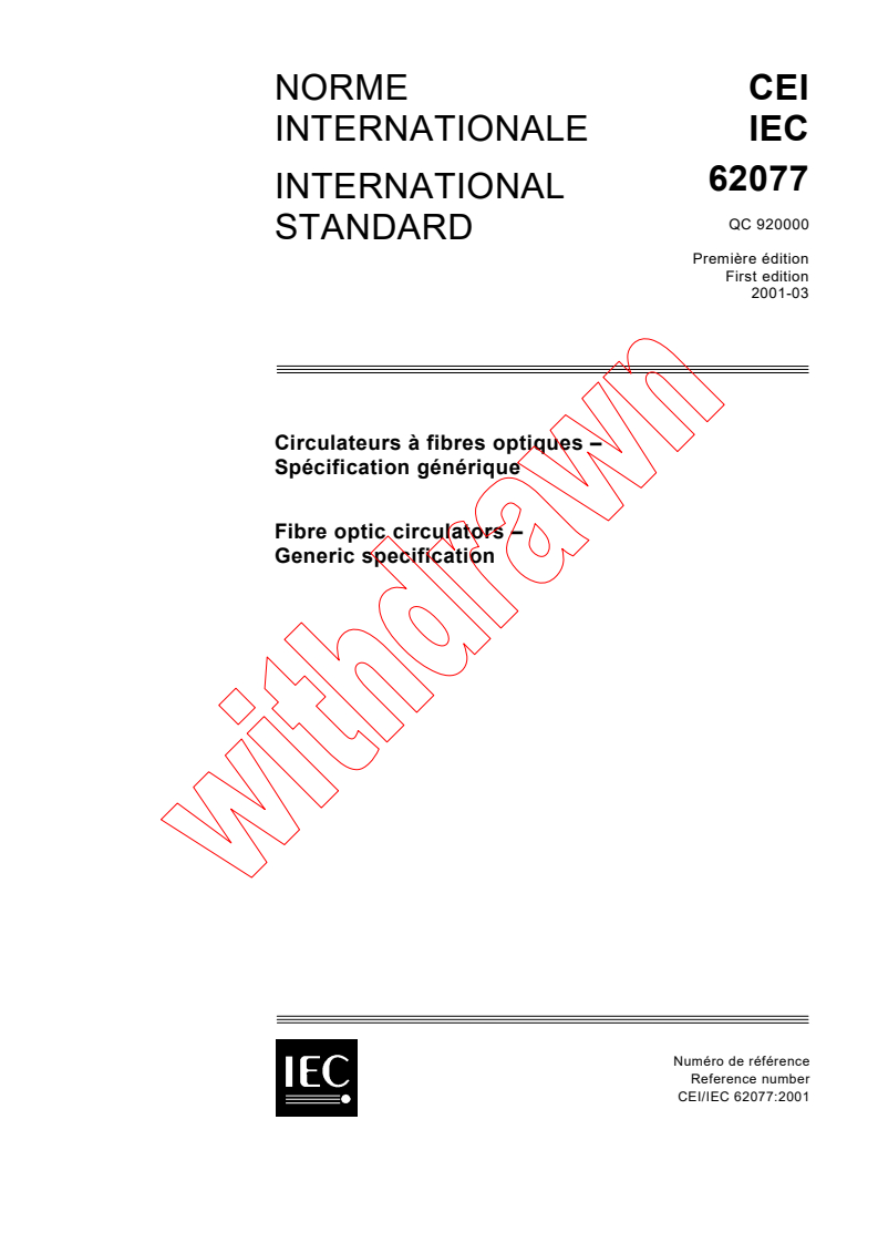 IEC 62077:2001 is a standard published by the International Electrotechnical Commission (IEC). Its full title is "Fibre optic circulators - Generic specification". This standard covers: Applies to fibre optic circulators, which are: - non-reciprocal optical devices - passive components - have three or more ports for directionally transmitting optical power. This standard establishes circulator requirements and quality assessment procedures.