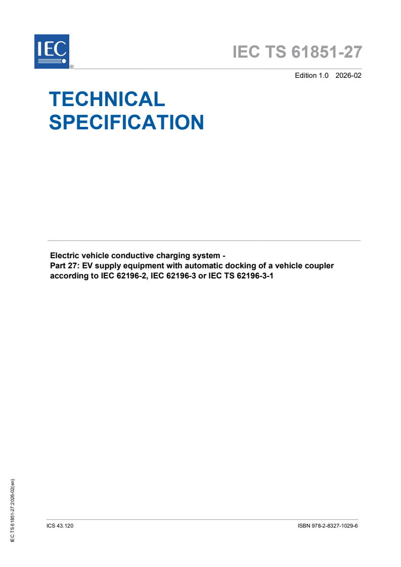 IEC TS 61851-27:2026 - Electric vehicle conductive charging system - Part 27: EV supply equipment with automatic docking of a vehicle coupler according to IEC 62196-2, IEC 62196-3 or IEC TS 62196-3-1 Released:4. 02. 2026 Isbn:9782832710296