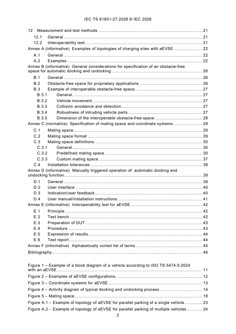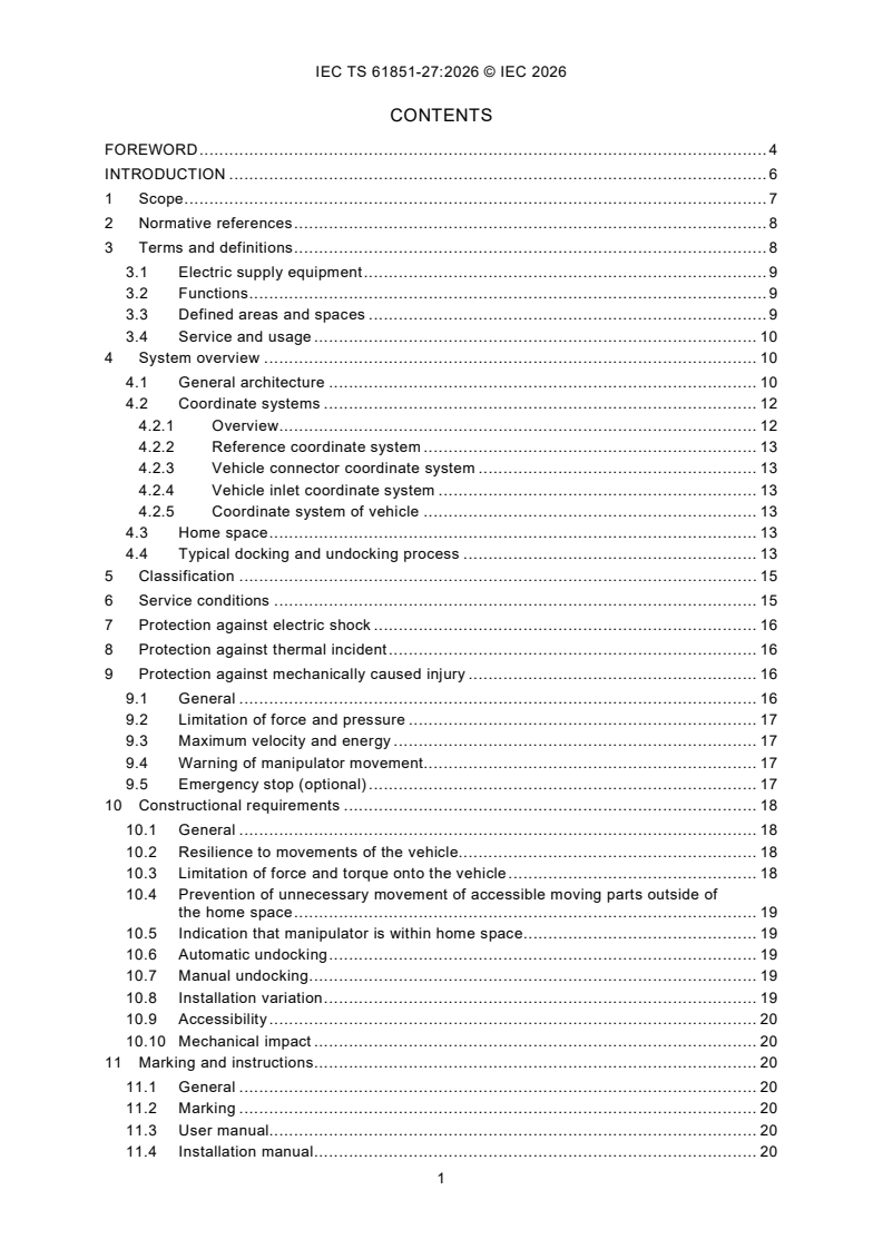 IEC TS 61851-27:2026, in combination with IEC 61851-1 or IEC 61851-23, gives the requirements for EV supply equipment with automatic docking and undocking functions (aEVSE) of a vehicle coupler according to IEC 62196-2, IEC 62196-3 or IEC TS 62196-3-1 for power transfer with electrically propelled road vehicles according to ISO TS 5474-5.