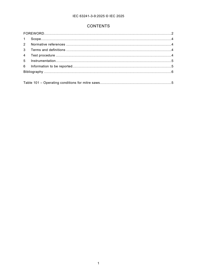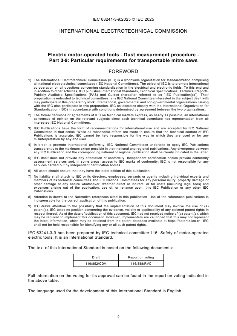 IEC 63241-3-9:2025 is a standard published by the International Electrotechnical Commission (IEC). Its full title is "Electric motor-operated tools - Dust measurement procedure - Part 3-9: Particular requirements for transportable mitre saws". This standard covers: IEC 63241-3-9: 2025 applies to transportable mitre saws intended to cut wood or wood-based materials. This document is to be used in conjunction with the first edition of IEC 63241-1:2023. This document supplements or modifies the corresponding clauses in IEC 63241-1, so as to convert it into the IEC Standard: Particular requirements for transportable mitre saws. Where a particular subclause of IEC 63241-1 is not mentioned in this document, that subclause applies as far as reasonable. Where this document states "addition", "modification" or "replacement", the relevant text in IEC 63241-1 is to be adapted accordingly. The following print types are used: - requirements: in roman type; - test specifications: in italic type; - notes: in small roman type. The terms defined in Clause 3 are printed in bold typeface. Subclauses, notes, tables and figures which are additional to those in IEC 63241-1 are numbered starting from 101. NOTE The attention of National Committees is drawn to the fact that equipment manufacturers and testing organizations can need a transitional period following publication of a new, amended or revised IEC publication in which to make products in accordance with the new requirements and to equip themselves for conducting new or revised tests. It is the recommendation of the committee that the content of this publication be adopted for implementation nationally not earlier than 36 months from the date of publication.