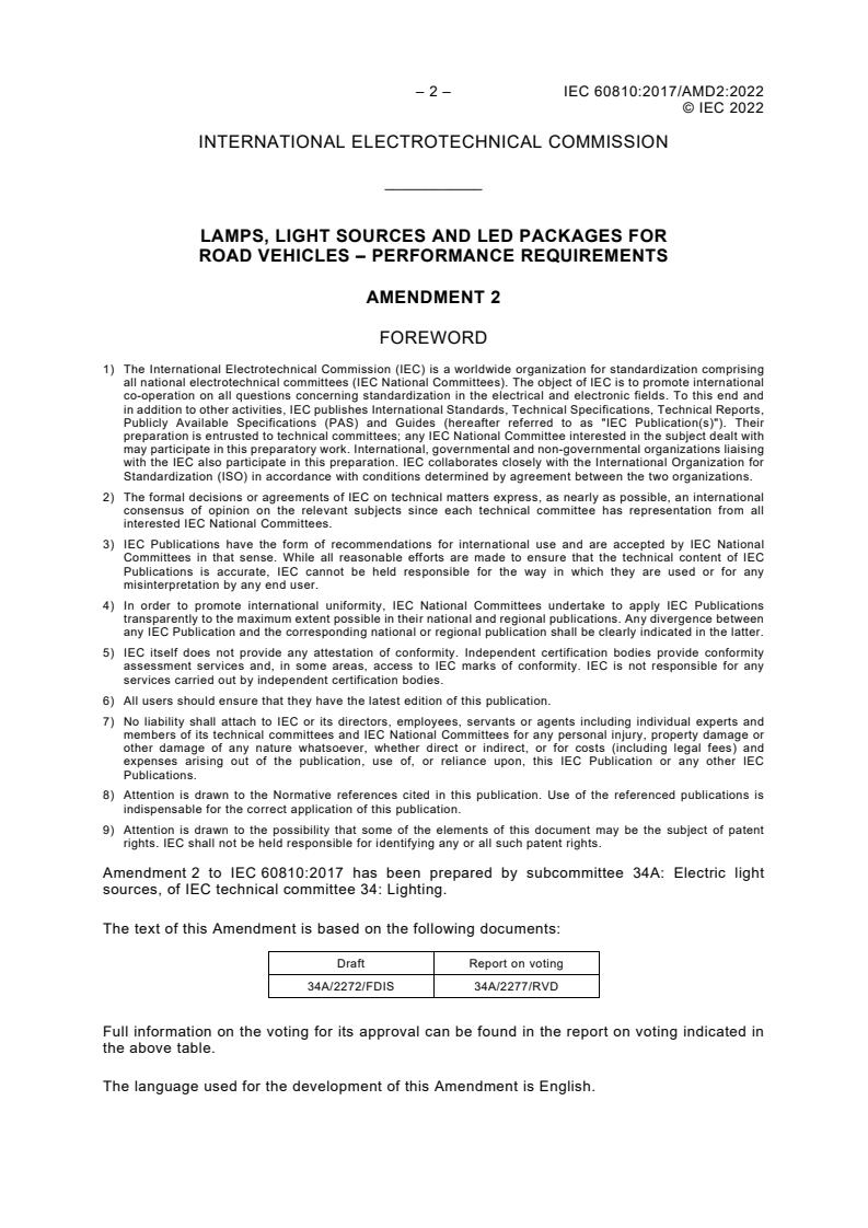 IEC 60810:2017/AMD2:2022 is the second amendment to the International Electrotechnical Commission’s standard IEC 60810, which addresses performance requirements for lamps, light sources, and LED packages used in road vehicles. This amendment updates and enhances performance criteria, test conditions, and technical specifications to ensure reliable functionality and safety in automotive lighting systems. Developed by IEC Technical Committee 34, Subcommittee 34A, this amendment aligns with the latest technological advancements and international regulations for vehicle lighting.