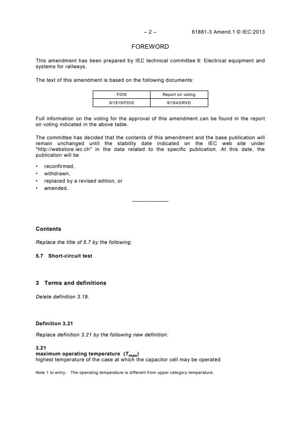 Amendment 1 - Railway applications - Rolling stock equipment - Capacitors for power electronics - Part 3: Electric double-layer capacitors