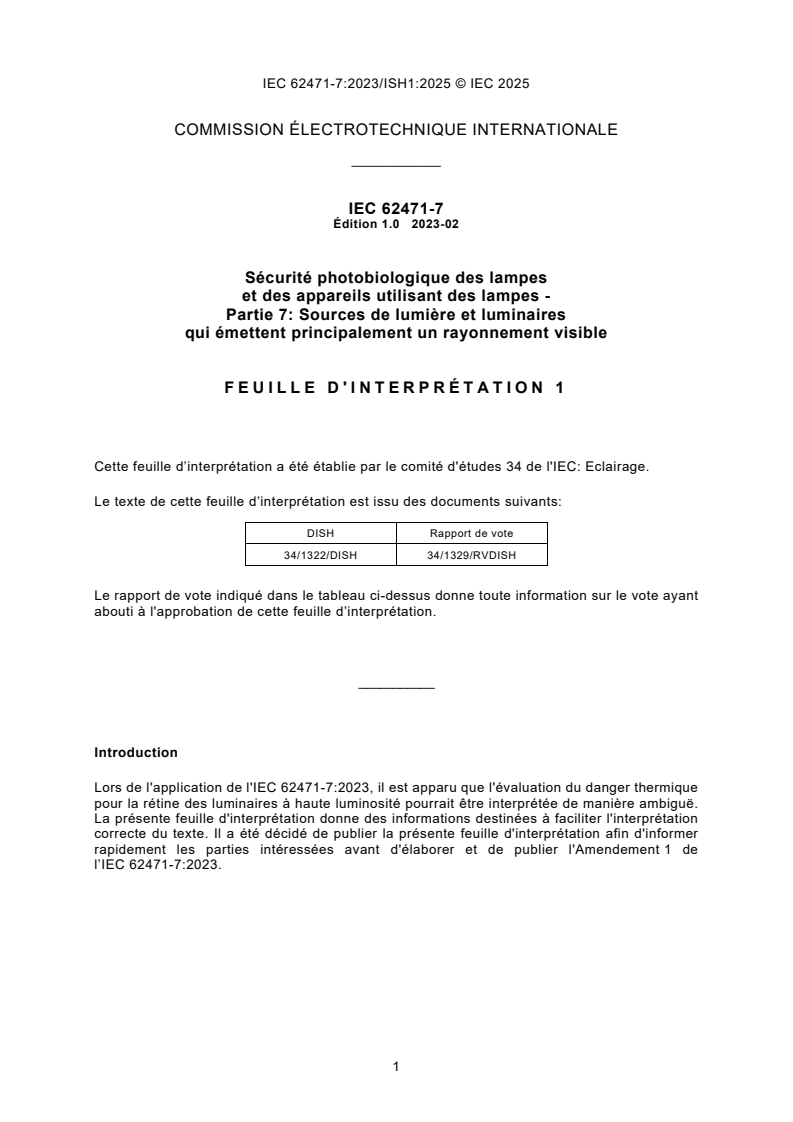 Feuille d'interprétation 1 - Sécurité photobiologique des lampes et des appareils utilisant des lampes – Partie 7: Sources de lumière et luminaires qui émettent principalement un rayonnement visible