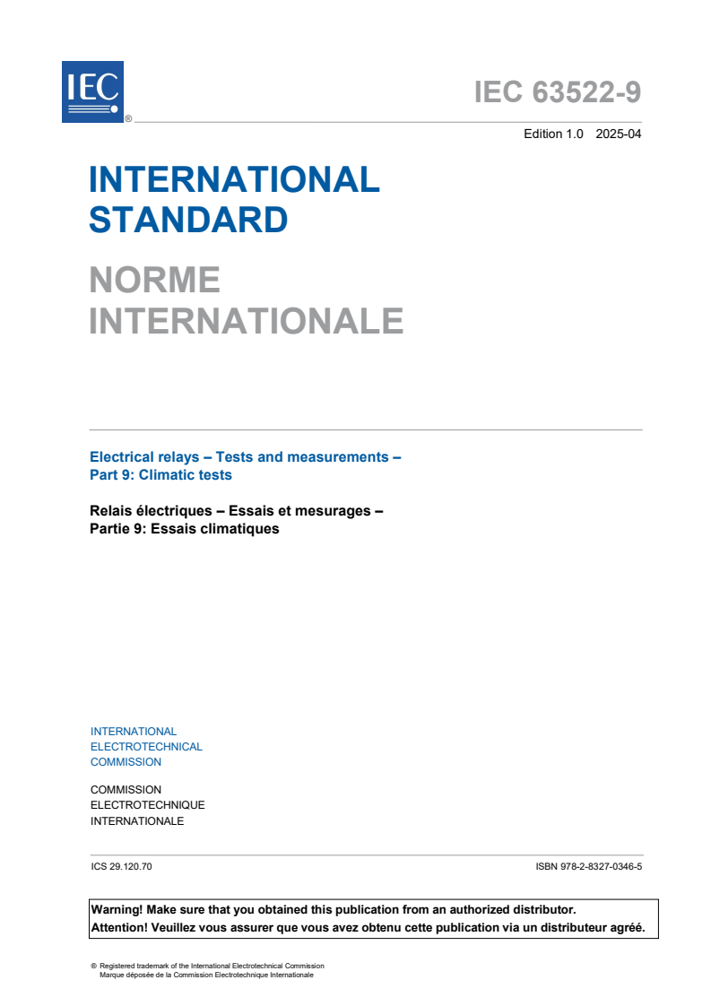 IEC 63522-9:2025 is an international standard published by the International Electrotechnical Commission (IEC) focusing on climatic testing of electrical relays. This standard defines rigorous test methods to evaluate an electrical relay’s ability to withstand various climatic conditions during transportation, storage, and operational use. The standard applies to a wide range of relays including electromechanical, reed, solid state, time relays, and hybrid technologies.