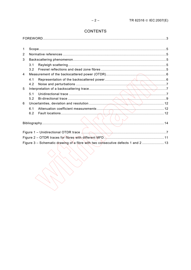 IEC TR 62316:2007 - "Guidance for the interpretation of OTDR backscattering traces" is a technical report from IEC that provides practical guidelines for analysing optical time-domain reflectometer (OTDR) traces. It explains the physical origins of backscatter (Rayleigh scattering), reflections (Fresnel), measurement representation, common perturbations and how to interpret unidirectional and bi-directional traces. The 2007 (second) edition adds discussion of polarization effects for unidirectional traces and a new clause on uncertainties, deviation and resolution.