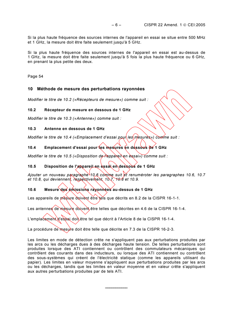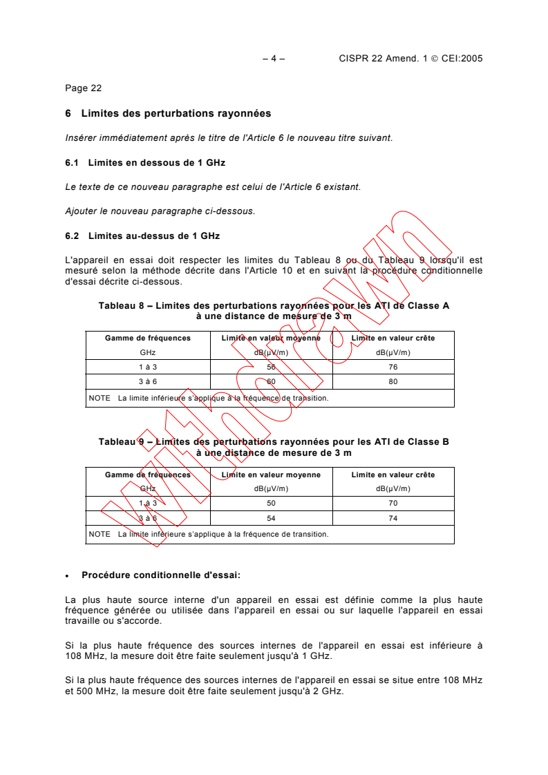 Cet amendement à la cinquième édition de la CISPR 22 spécifie des limites de perturbations rayonnées et une méthode de mesure de ces perturbations dans le domaine de fréquences de 1 GHz à 6 GHz.