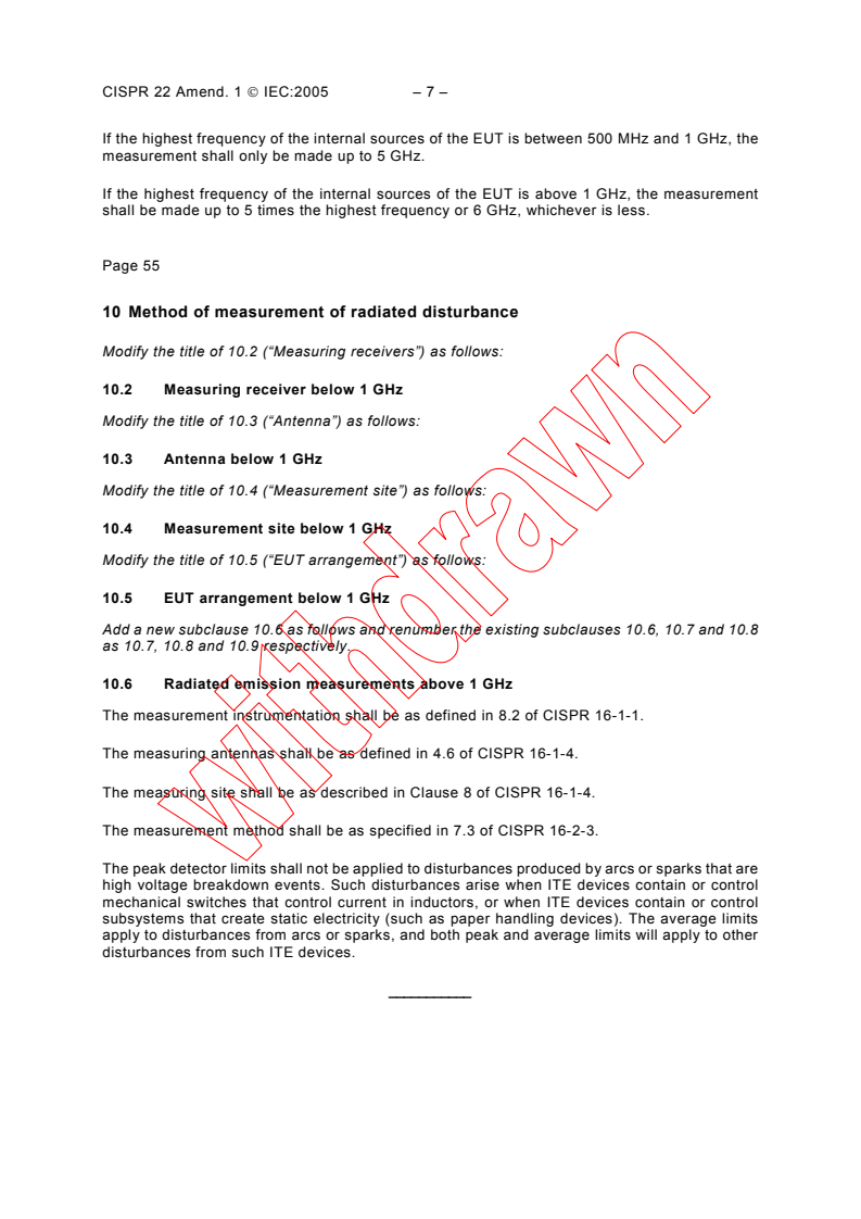 This amendment to the fifth edition of CISPR 22 specifies emission limits and method of measurement of radiated disturbances in the frequency range 1 GHz to 6 GHz.