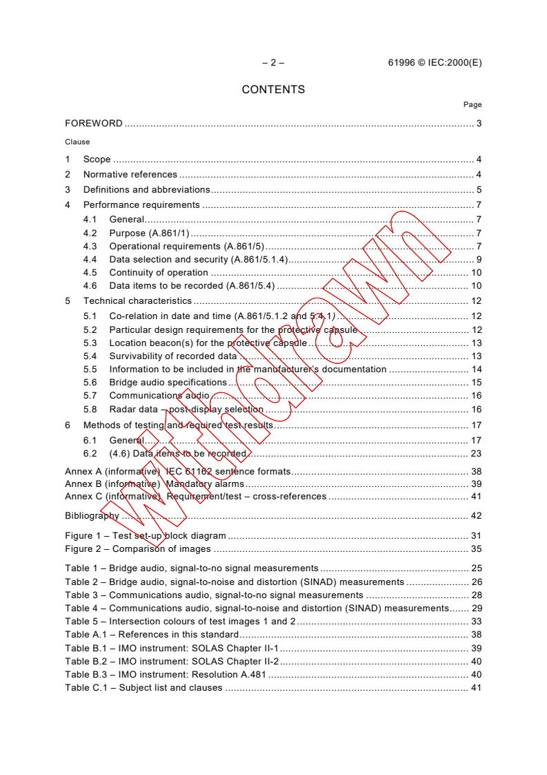 IEC 61996:2000 is a standard published by the International Electrotechnical Commission (IEC). Its full title is "Maritime navigation and radiocommunication equipment and systems - Shipborne voyage data recorder (VDR) - Performance requirements - Methods of testing and required test results". This standard covers: Specifies the minimum performance requirements, technical characteristics and methods of testing and required test results, for shipborne voyage data recorder (VDR) installations as required by the International Convention for Safety of Life at Sea (SOLAS). Takes into account IMO resolution A.694 as well as the applicable parts of the performance standards included in IMO Resolution A.861 and is associated with IEC 60945.