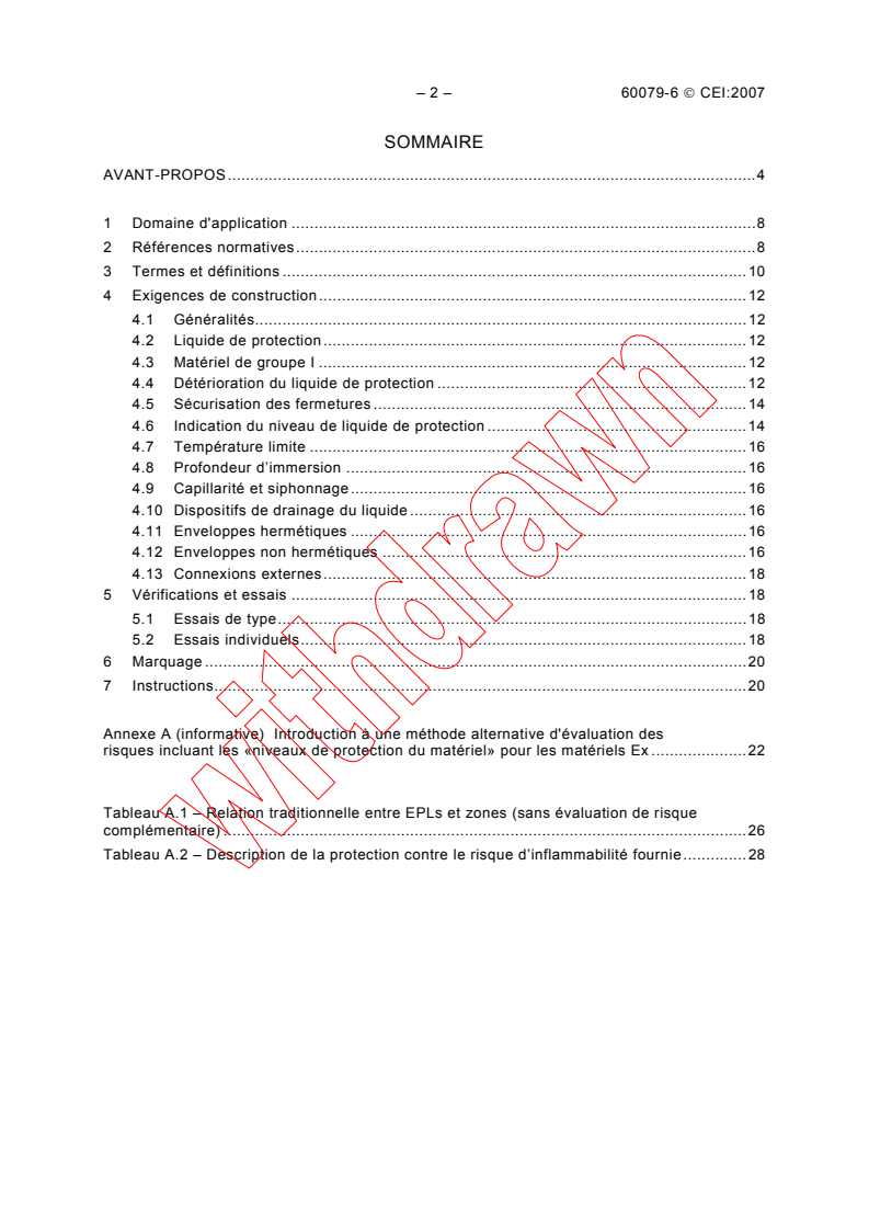IEC 60079-6:2007 is a standard published by the International Electrotechnical Commission (IEC). Its full title is "Explosive atmospheres - Part 6: Equipment protection by oil immersion "o"". This standard covers: This part of IEC 60079 specifies the requirements for the construction and testing of oil-immersed electrical equipment, oil-immersed parts of electrical equipment and Ex components in the type of protection oil immersion "o", intended for use in explosive gas atmospheres. The significant changes with respect to the previous edition are: all requirements for third-party certification removed; added requirements for external connections; collected all marking requirements in the marking clause, and added requirements for instructions.