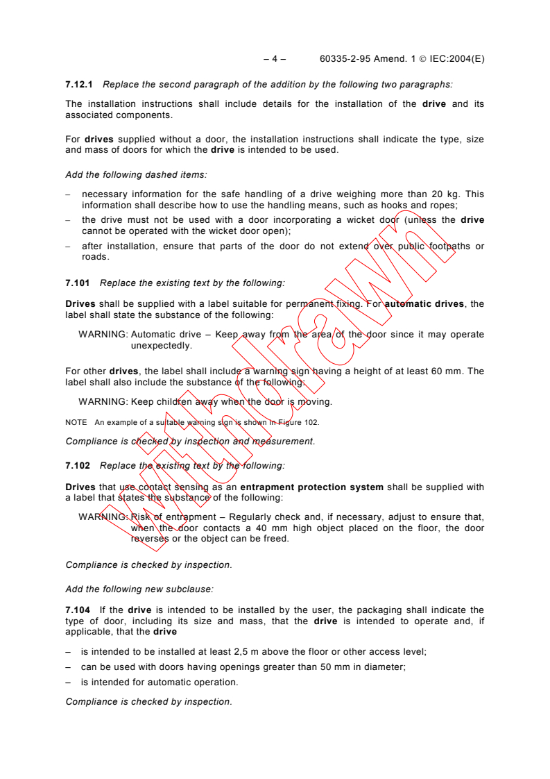 IEC 60335-2-95:2002/AMD1:2004 - Amendment 1 - Household and similar electrical appliances - Safety - Part 2-95: Particular requirements for drives for vertically moving garage doors for residential use Released:11/24/2004 Isbn:283187727X
