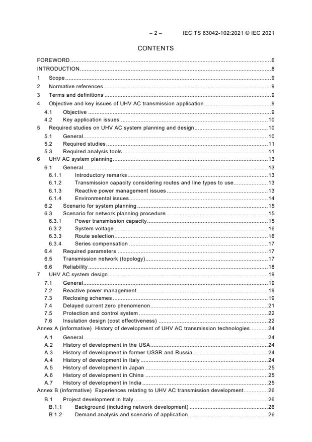 IEC TS 63042-102:2021 is a technical specification published by the International Electrotechnical Commission (IEC). Its full title is "UHV AC transmission systems - Part 102: General system design". This standard covers: IEC TS 63042-102:2021(E) specifies the procedure to plan and design UHV transmission projects and the items to be considered. The objective of UHV AC power system planning and design is to achieve both economic efficiency and high reliability, considering its impact on EHV systems.