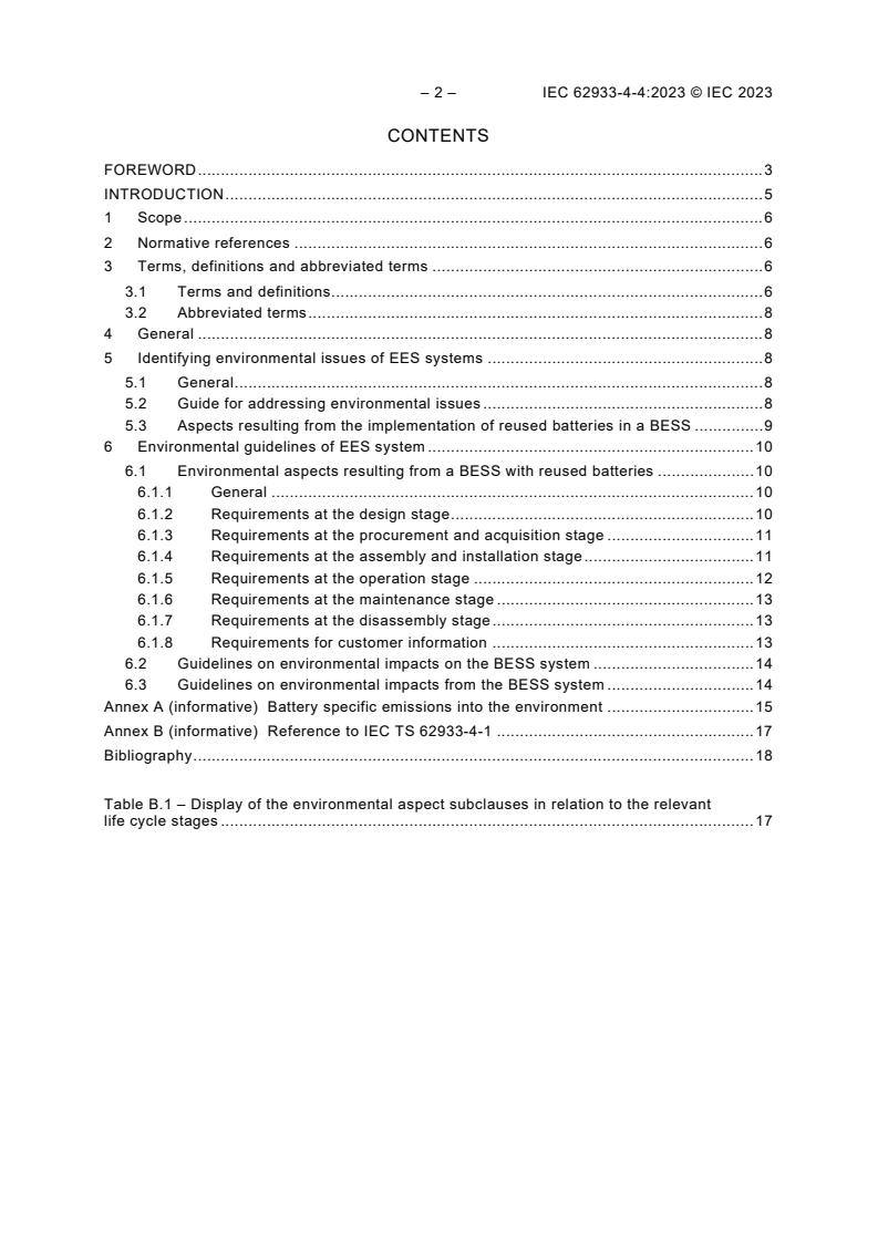 IEC 62933-4-4:2023 is a standard published by the International Electrotechnical Commission (IEC). Its full title is "Electrical energy storage (EES) systems - Part 4-4: Environmental requirements for battery-based energy storage systems (BESS) with reused batteries". This standard covers: IEC 62933-4-4:2023 describes environmental issues when reused batteries are considered for a BESS. It provides details and requirements for identifying and preventing environmental issues in each life cycle stage, i.e., from the design to the disassembly of such reused batteries in a BESS.