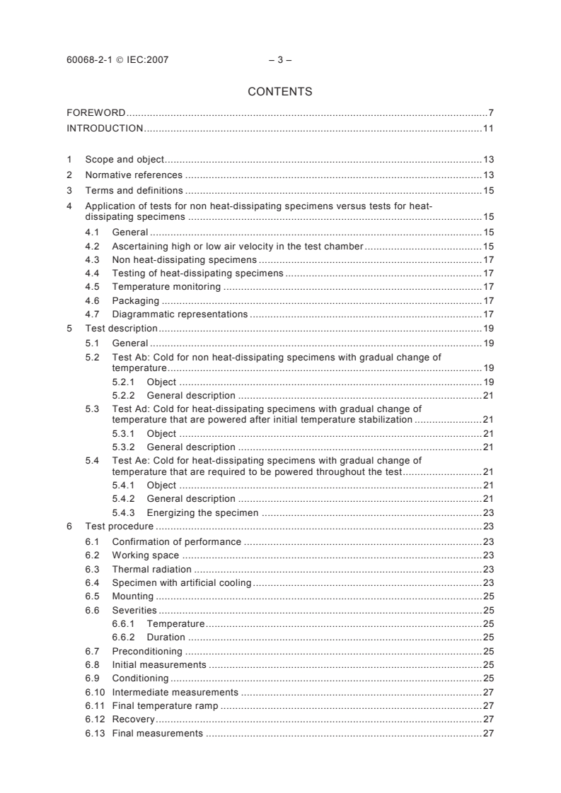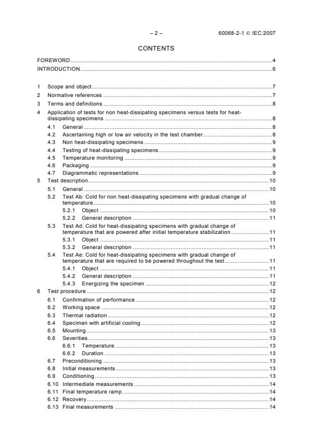 The procedures given in this standard are normally intended for specimens that achieve temperature stability during the performance of the test procedure. Temperature chamber(s) are constructed and verified in accordance with specifications IEC 60068-3-5 and IEC 60068-3-7. Further guidance for dry heat and cold tests can be found in IEC 60068-3-1 and general guidance in IEC 60068-1. This sixth edition deals with cold tests applicable both to non heat-dissipating and heat-dissipating specimens. For non heat-dissipating specimens, Tests Ab and Ad do not deviate essentially from earlier issues. Test Ae has been added primary for testing equipment that requires being operational throughout the test including the conditioning periods.