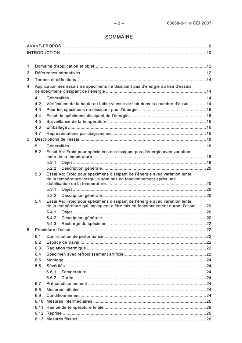 La procédure décrite dans cette norme est normalement prévue pour les spécimens qui atteignent la stabilité thermique pendant le déroulement de l'essai. La ou les chambres d'essai en température doivent être conçues et vérifiées selon les spécifications de la CEI 60068-3-5 et de la CEI 60068-3-7. D'autres conseils pour les essais de froid et de chaleur sèche peuvent être trouvés dans la CEI 60068-3-1 et des conseils généraux dans la CEI 60068-1. Cette sixième édition traite des essais de froid applicables à la fois aux spécimens dissipant de l'énergie et à ceux ne dissipant pas d'énergie. Les essais Ab et Ad destinés à des spécimens ne dissipant pas d'énergie ne présentent pas de modifications importantes par rapport aux éditions précédentes. L'essai Ae a été ajouté principalement pour les appareils d'essais qui impliquent d'être en fonctionnement pendant l'essai incluant des périodes de conditionnement.