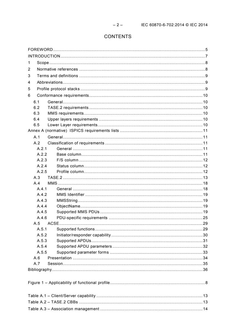 IEC 60870-6-702:2014 is a standard published by the International Electrotechnical Commission (IEC). Its full title is "Telecontrol equipment and systems - Part 6-702: Telecontrol protocols compatible with ISO standards and ITU-T recommendations - Functional profile for providing the TASE.2 application service in end systems". This standard covers: IEC 60870-6-702:2014 is a functional profile (FP) and defines the provision of the TASE.2 communications services between two control centre end systems. It is supported by the transport services implemented in accordance with transport-profiles defined for the type of network that interconnects the control centre end systems. The main changes with respect to the previous edition are listed below: - certain objects were moved from being normative to informative; - certain TASE.2 conformance blocks have been made out-of-scope. These changes were made in order to remove TASE.2 blocks that were seldom used and whose capabilities are typically implemented by some other means besides TASE.2. This was done to promote interoperability of implementations from an application perspective.