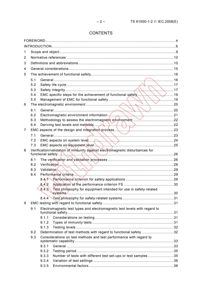 IEC TS 61000-1-2:2008 is a technical specification published by the International Electrotechnical Commission (IEC). Its full title is "Electromagnetic compatibility (EMC) - Part 1-2: General - Methodology for the achievement of functional safety of electrical and electronic systems including equipment with regard to electromagnetic phenomena". This standard covers: IEC/TS 61000-1-2:2008(E) establishes a methodology for the achievement of functional safety only with regard to electromagnetic phenomena of electrical and electronic systems and installations, as installed and used under operational conditions. This methodology includes the implication it has on equipment used in such systems and installations. IEC/TS 61000-1-2:2008: a) applies to safety-related systems incorporating electrical/electronic/programmable electronic equipment; b) considers the influence of the electromagnetic environment on safety-related systems; it is intended for designers, manufacturers and installers of safety-related systems and can be used as a guide by IEC committees; c) is not concerned with direct hazards from electromagnetic fields on living beings nor is it concerned with safety related to breakdown of insulation or other mechanisms by which persons can be exposed to electrical hazards. IEC/TS 61000-1-2:2008 mainly covers EMC related aspects of the design phase of safety-related systems and equipment used therein, and deals in particular with - some basic concepts in the area of functional safety, - the various EMC specific steps for the achievement and management of functional safety, - the description and assessment of the electromagnetic environment, - the EMC aspects of the design and integration process taking into account the process of EMC safety planning on system as well as on equipment level, - the validation and verification processes regarding the immunity against electromagnetic disturbances, - the performance criterion and some test philosophy considerations for safety-related systems and the equipment used therein, - aspects related to testing of the immunity of safety-related systems and equipment used therein against electromagnetic disturbances. IEC/TS 61000-1-2:2008 is applicable to safety-related systems intended to comply with the requirements of IEC 61508 and/or associated sector-specific functional safety standards. For safety-related systems covered by other functional safety standards, a consideration shall be made of the requirements of this Technical Specification in order to identify the appropriate measures that shall be taken with relation to EMC and functional safety. IEC/TS 61000-1-2:2008 may also be used as a guide for considering EMC requirements for other systems having a direct contribution to safety. IEC/TS 61000-1-2:2008 has the status of a basic safety publication in accordance with IEC Guide 104. This second edition cancels and replaces the first edition published in 2001 and constitutes a technical revision. The main changes are the following: - For safety-related systems that use electrical, electronic or programmable electronic technologies, the technical information, definitions, terminology and text of this second edition have been aligned to IEC 61508. - Risk assessment requirements and methodologies have been deleted from this document, so as not to duplicate or clash with IEC 61508. - It now makes a clear distinction between complete safety-related systems and items of equipment that might be used in such systems, and clarifies its application by the different types of end-users. - It focuses more on appropriate design methods, and their verification and validation. - The methodology for assessing and specifying electromagnetic environments has been extended. - The combination of electromagnetic and physical/climatic influences are taken into account.