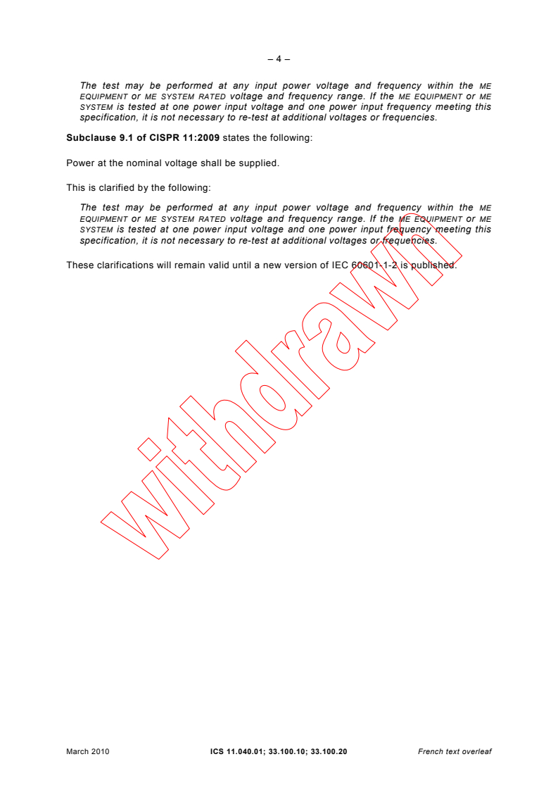 IEC 60601-1-2:2007/ISH1:2010 - Interpretation sheet 1 - Medical electrical equipment - Part 1-2: General requirements for basic safety and essential performance - Collateral standard: Electromagnetic compatibility - Requirements and tests Released:3/16/2010
