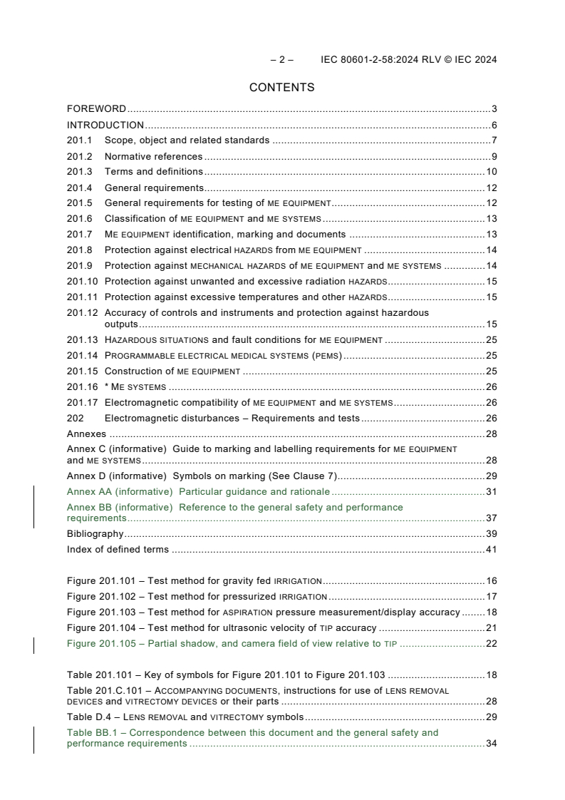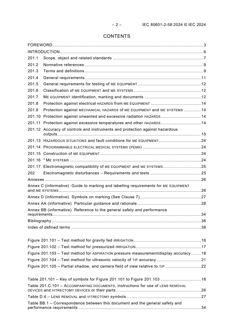 IEC 80601-2-58:2024 applies to the BASIC SAFETY and ESSENTIAL PERFORMANCE of LENS REMOVAL DEVICES and VITRECTOMY DEVICES for ophthalmic surgery (as defined in 201.3.209 and 201.3.217) and associated ACCESSORIES that can be connected to this MEDICAL ELECTRICAL EQUIPMENT, hereafter referred to as ME EQUIPMENT. If a clause or subclause is specifically intended to be applicable to ME EQUIPMENT only, or to ME SYSTEMS only, the title and content of that clause or subclause will say so. If that is not the case, the clause or subclause applies both to ME EQUIPMENT and to ME SYSTEMS, as relevant. HAZARDS inherent in the intended physiological function of ME EQUIPMENT or ME SYSTEMS within the scope of this document are not covered by specific requirements in this document except in 7.2.13 of IEC 60601-1:2005 and IEC 60601 1:2005/AMD2:2020 and 8.4.1 of IEC 60601-1:2005. IEC 80601-2-58:2024 cancels and replaces the second edition published in 2014 and its Amendment 1:2016. This edition constitutes a technical revision. This edition includes the following significant technical changes with respect to the previous edition: a) the alignment of this particular standard based on the amendment of IEC 60601-1:2005, IEC 60601-1:2005/AMD1:2012 and IEC 60601-1:2005/AMD2:2020; b) updating collateral, particular and IEC 60601-1:2005, IEC 60601-1:2005/AMD1:2012 and IEC 60601-1:2005/AMD2:2020 references to align with amendments to IEC 60601-1:2005, IEC 60601-1:2005/AMD1:2012 and IEC 60601-1:2005/AMD2:2020 and other collateral standards; c) updated normative references; d) added new requirement for particulate matter from APPLIED PARTS in 201.9.5.101; e) adding the shadow light method in 201.12.1.101.7; f) clarify test conditions for EMC requirements in 202.7.1.2; g) updated Table D.4 references to include specific IEC references to the symbols and delete “Annex AA, 201.7.6.101”; h) include a new annex to address the relevant general safety and performance requirements of European regulation (EU) 2017/745 (Annex BB); i) remove all references of the LIQUEFACTION FRAGMENTATION LENS REMOVAL method.
