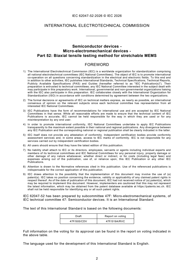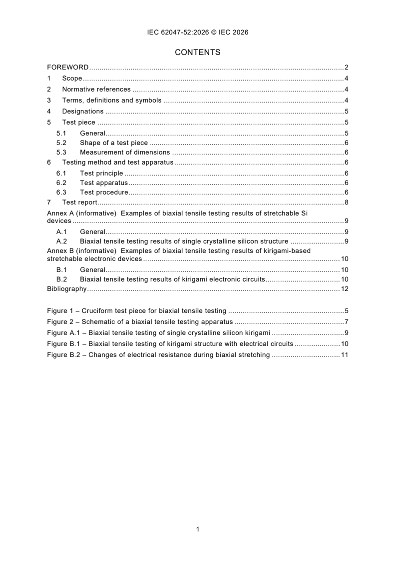 IEC 62047-52:2026 specifies a testing method for measuring device performance and failure strain under biaxial tensile deformation in stretchable MEMS materials. The typical examples of the stretchable MEMS materials are flexible single crystalline silicon structures, MEMS circuit boards, interconnected MEMS on a stretchable substrate. The test piece has a cruciform geometry and the test piece thickness ranges from 1 μm to 100 μm with the same thickness as the actual devices. Since the failure strain can vary depending on loading conditions like uniaxial tension and equi-biaxial tension, a biaxial load is applied to a cruciform test piece with varying strain ratio between two perpendicular loading directions.